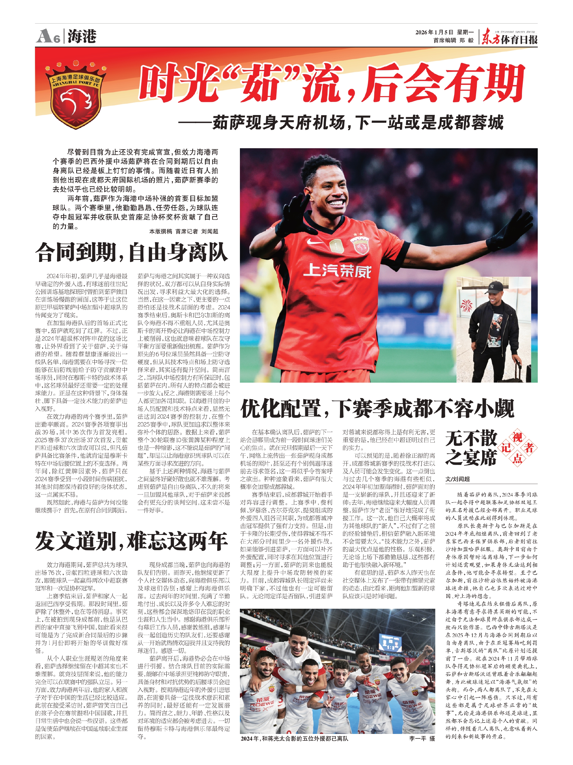 可以预见的是,随着徐正源的离开,成都蓉城新赛季的技战术打法以及人员可能会发生变化。这一点倒也与过去几个赛季的海港有些相似,2024年年初加盟海港时,茹萨面对的是一支崭新的球队,并且还迎来了新帅;去年,海港继续迎来大幅度人员调整,茹萨作为“老臣”很好地完成了衔接工作。这一次,他自己大概率将成为其他球队的“新人”,不过有了之前的经验铺垫后,相信茹萨融入新环境不会需要太久。“技术能力之外,茹萨的最大优点是他的性格。乐观积极,无论场上场下都勤勤恳恳,这些都有助于他很快融入新环境。”