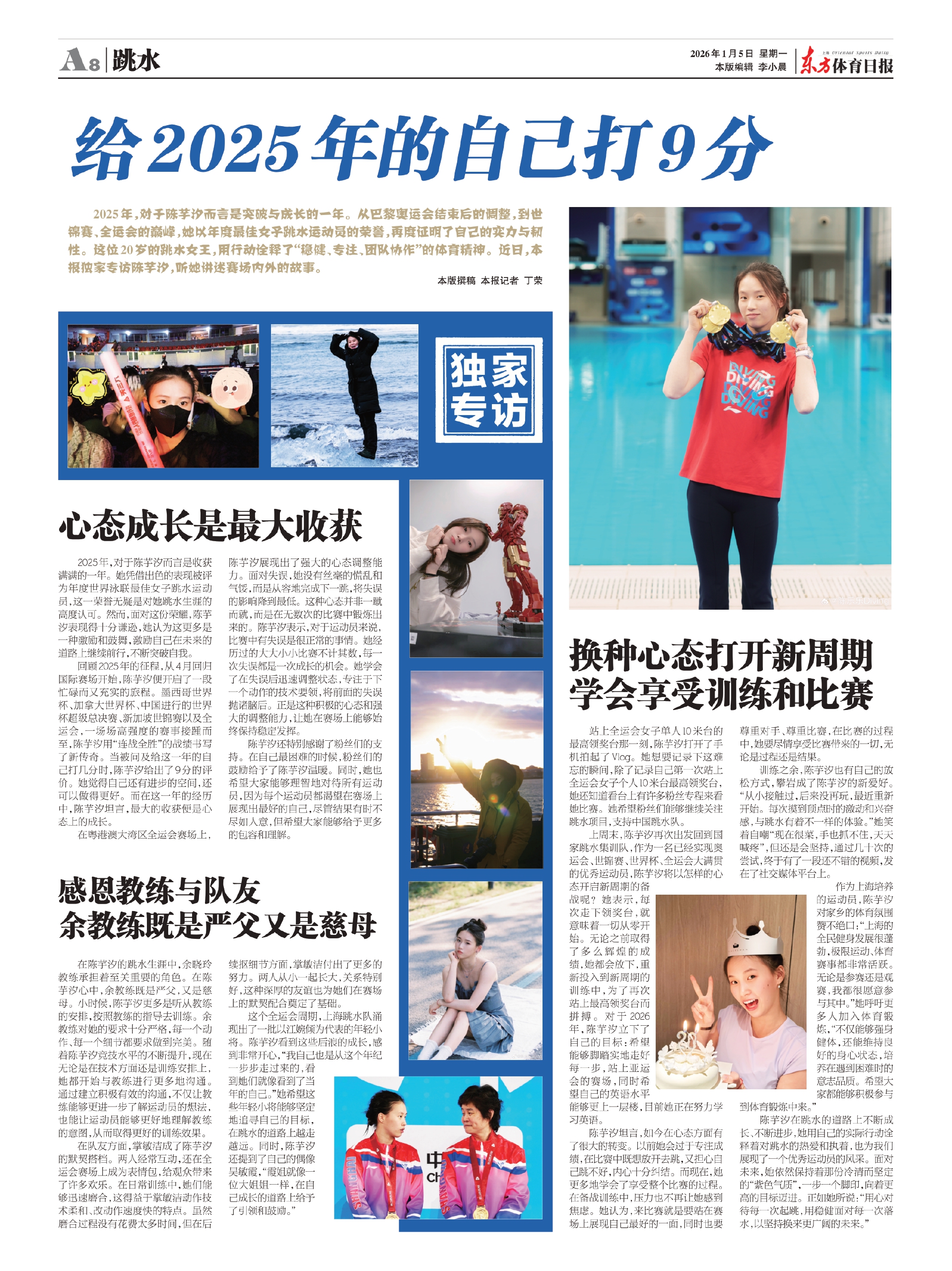 2025年,对于陈芋汐而言是突破与成长的一年。从巴黎奥运会结束后的调整,到世锦赛、全运会的巅峰,她以年度最佳女子跳水运动员的荣誉,再度证明了自己的实力与韧性。这位20岁的跳水女王,用行动诠释了“稳健、专注、团队协作”的体育精神。近日,本报独家专访陈芋汐,听她讲述赛场内外的故事。