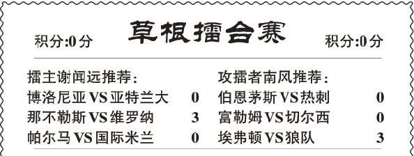 编者按:东方彩经竞彩大联赛从2017年3月起推出“草根擂台赛”,每期由两名草根选手单选3场比赛PK,中1场得100分,中2场得300分,3场全中得600分。上月擂主守擂成功。