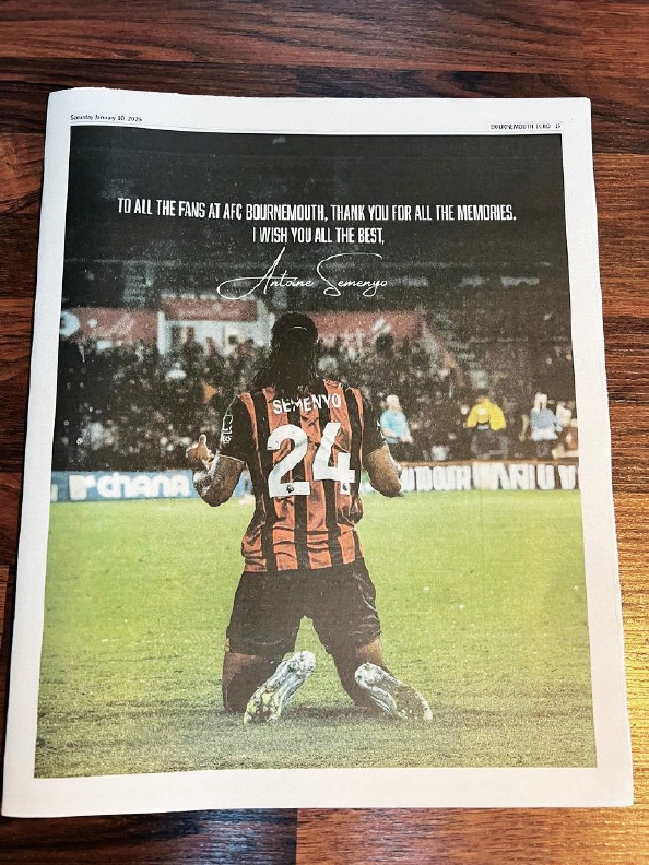 塞梅尼奥在伯恩茅斯当地报纸上刊登整版广告,向伯恩茅斯球迷表达感谢,“感谢所有回忆,祝大家一切顺利。”
