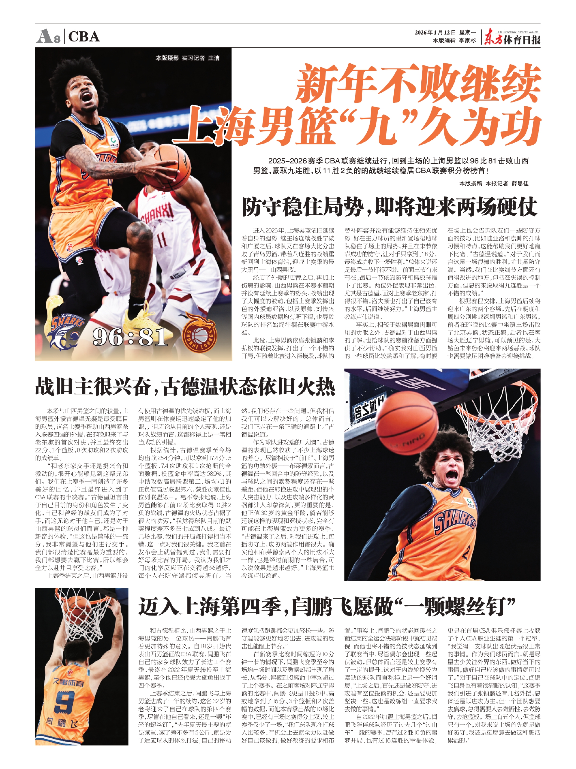 2025-2026赛季CBA联赛继续进行,回到主场的上海男篮以96比81击败山西男篮,豪取九连胜,以11胜2负的的战绩继续稳居CBA联赛积分榜榜首!