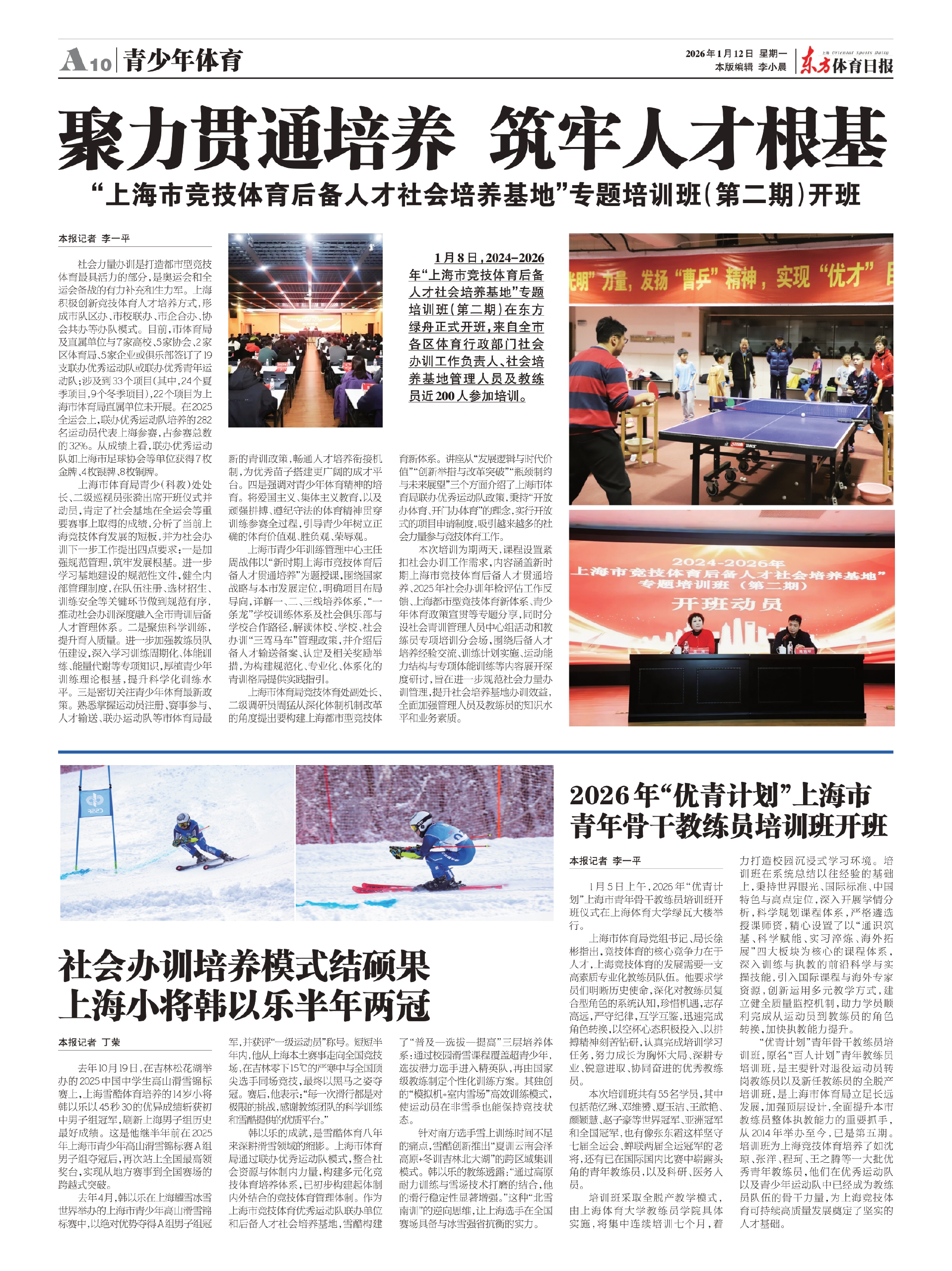 1月8日,2024-2026年“上海市竞技体育后备人才社会培养基地”专题培训班(第二期)在东方绿舟正式开班,来自全市各区体育行政部门社会办训工作负责人、社会培养基地管理人员及教练员近200人参加培训。