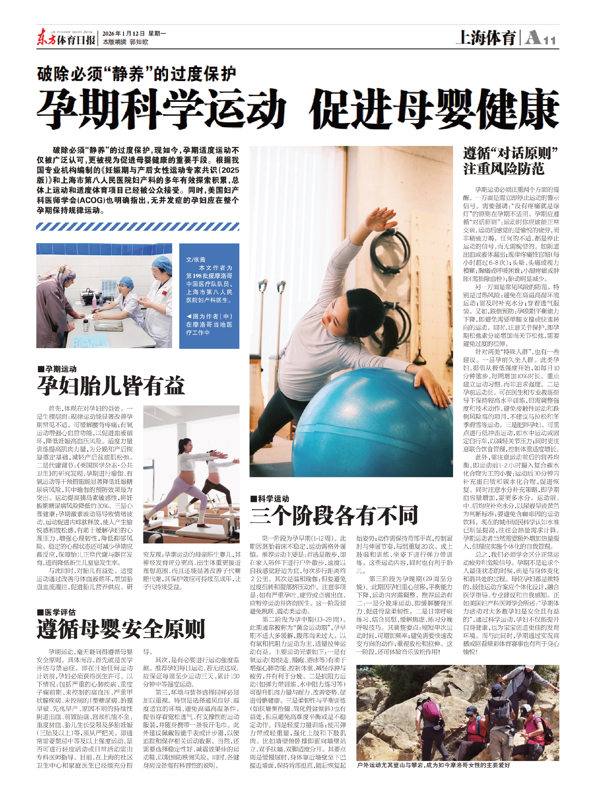 破除必须“静养”的过度保护,现如今,孕期适度运动不仅被广泛认可,更被视为促进母婴健康的重要手段。根据我国专业机构编制的《妊娠期与产后女性运动专家共识(2025版)》和上海市第八人民医院妇产科的多年有效探索积累,总体上运动和适度体育项目已经被公众接受。同时,美国妇产科医师学会(ACOG)也明确指出,无并发症的孕妇应在整个孕期保持规律运动。