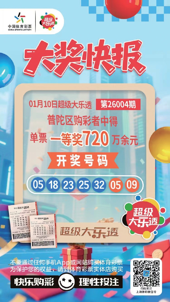 本期本市开出1注基础一等奖,出自一张票面金额为10元的5注直选单式票,单票奖金720万余元。该张大乐透彩票出自位于普陀区石泉路464号东南间的08033网点,这也是上海2026年诞生的首个大乐透一等奖。