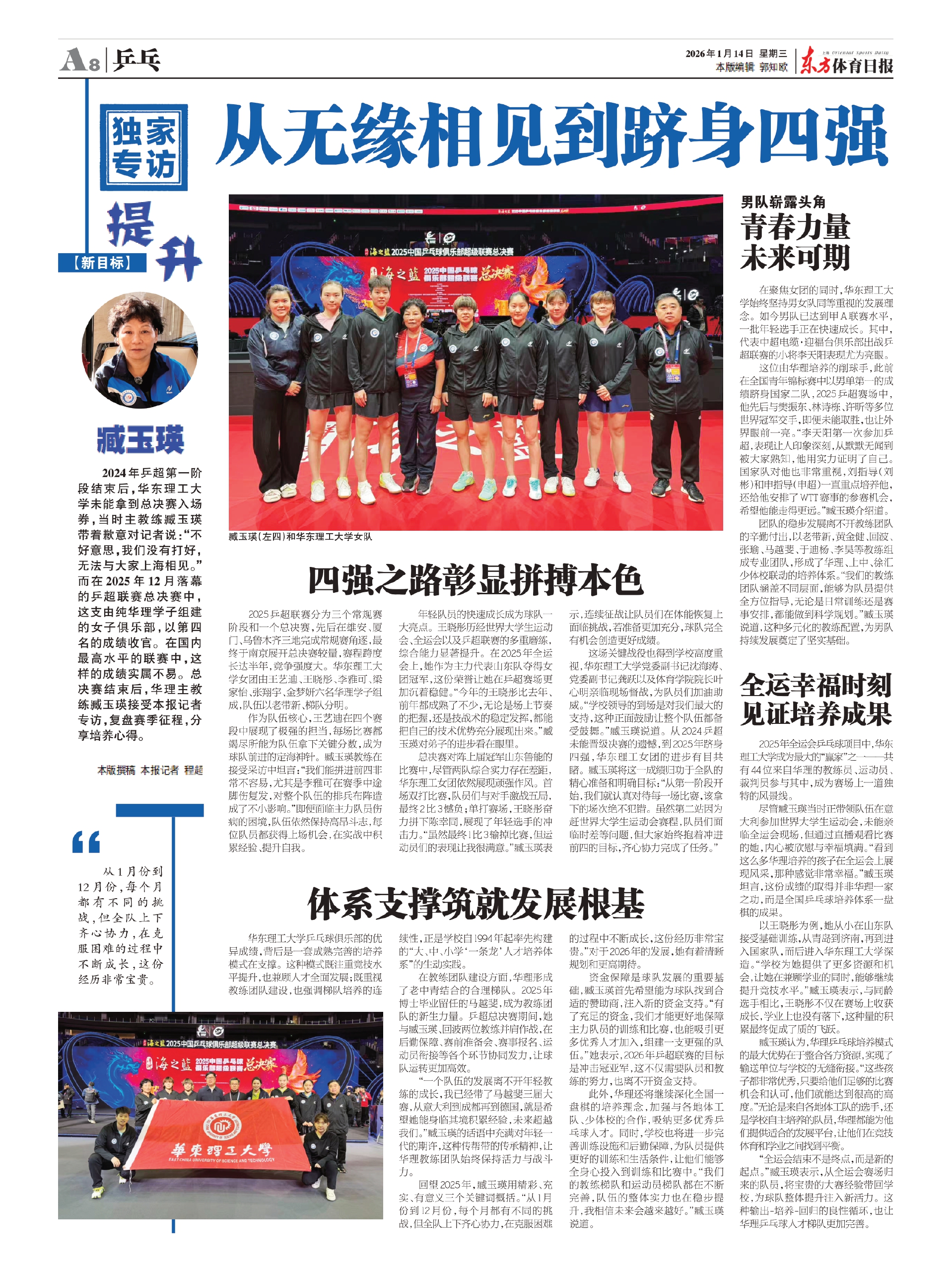 2024年乒超第一阶段结束后,华东理工大学未能拿到总决赛入场券,当时主教练臧玉瑛带着歉意对记者说:“不好意思,我们没有打好,无法与大家上海相见。”而在2025年12月落幕的乒超联赛总决赛中,这支由纯华理学子组建的女子俱乐部,以第四名的成绩收官。在国内最高水平的联赛中,这样的成绩实属不易。总决赛结束后,华理主教练臧玉瑛接受本报记者专访,复盘赛季征程,分享培养心得。