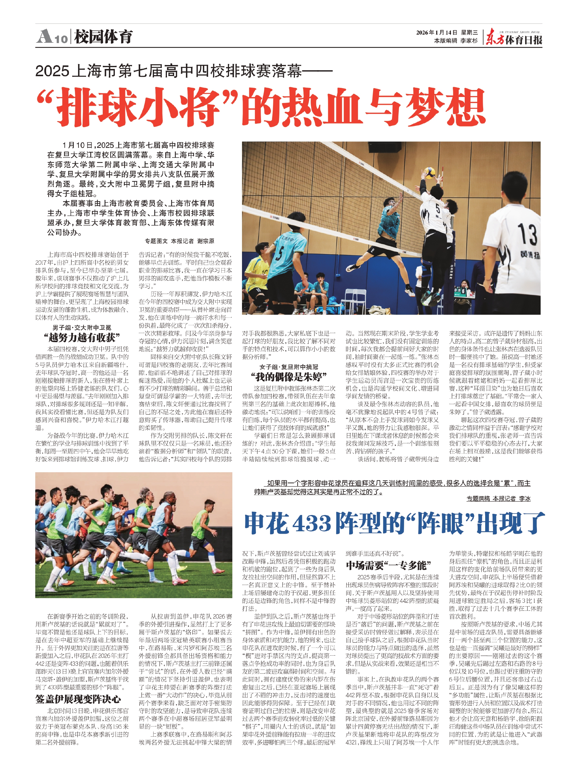 1月10日,2025上海市第七届高中四校排球赛在复旦大学江湾校区圆满落幕。来自上海中学、华东师范大学第二附属中学、上海交通大学附属中学、复旦大学附属中学的男女排共八支队伍展开激烈角逐。最终,交大附中卫冕男子组,复旦附中摘得女子组桂冠。