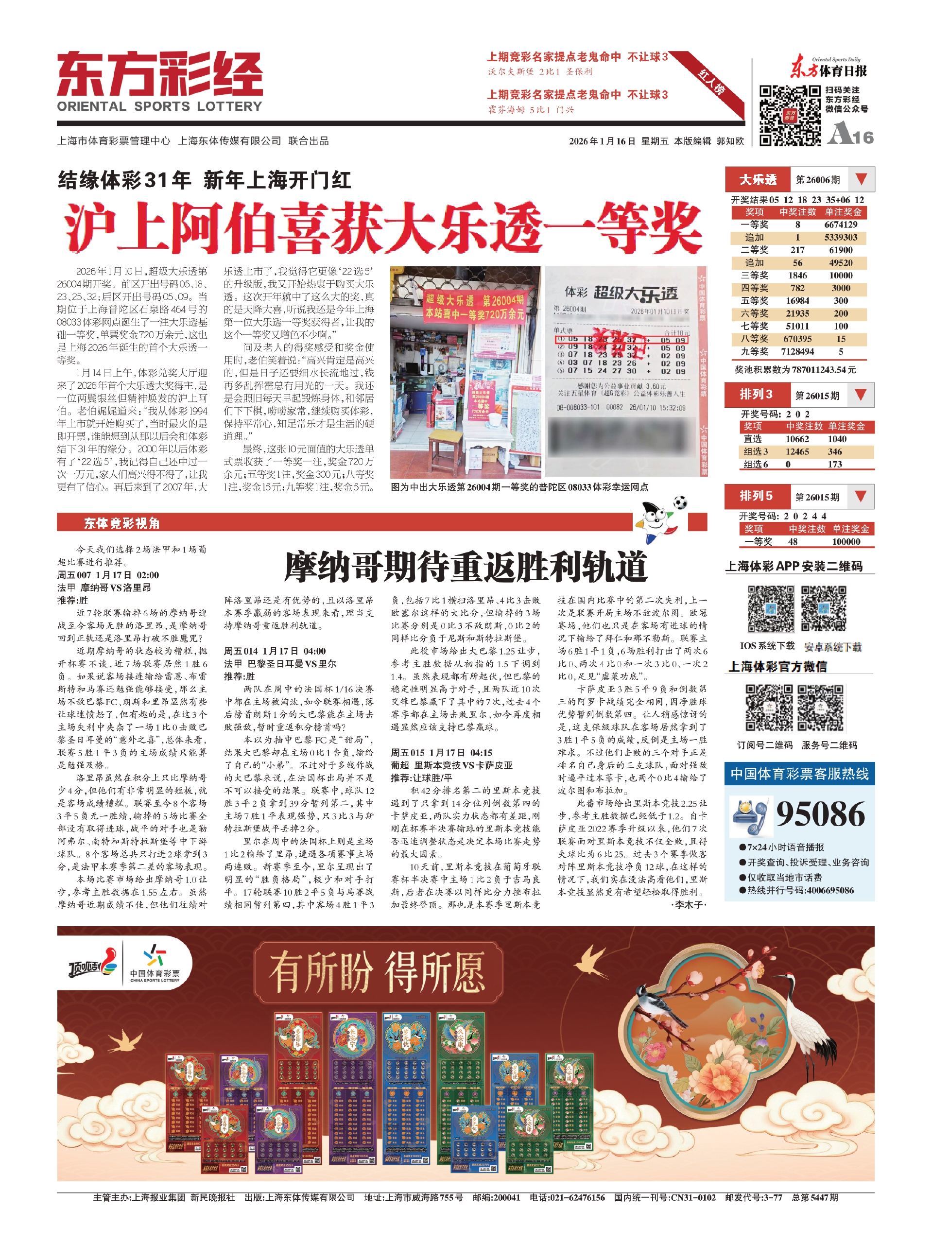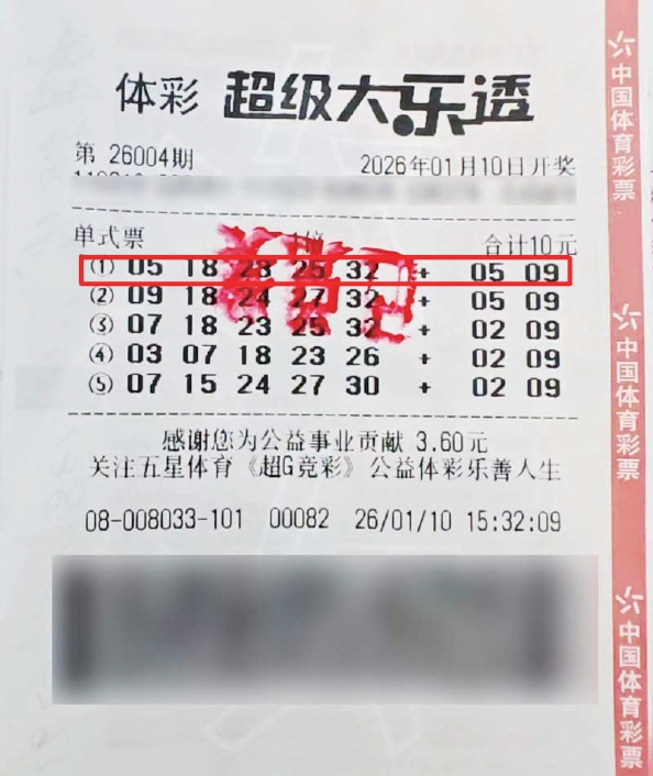 2026年1月10日,超级大乐透第26004期开奖。前区开出号码05、18、23、25、32;后区开出号码05、09。当期位于上海普陀区石泉路464号的08033体彩网点诞生了一注大乐透基础一等奖,单票奖金720万余元,这也是上海2026年诞生的首个大乐透一等奖。
