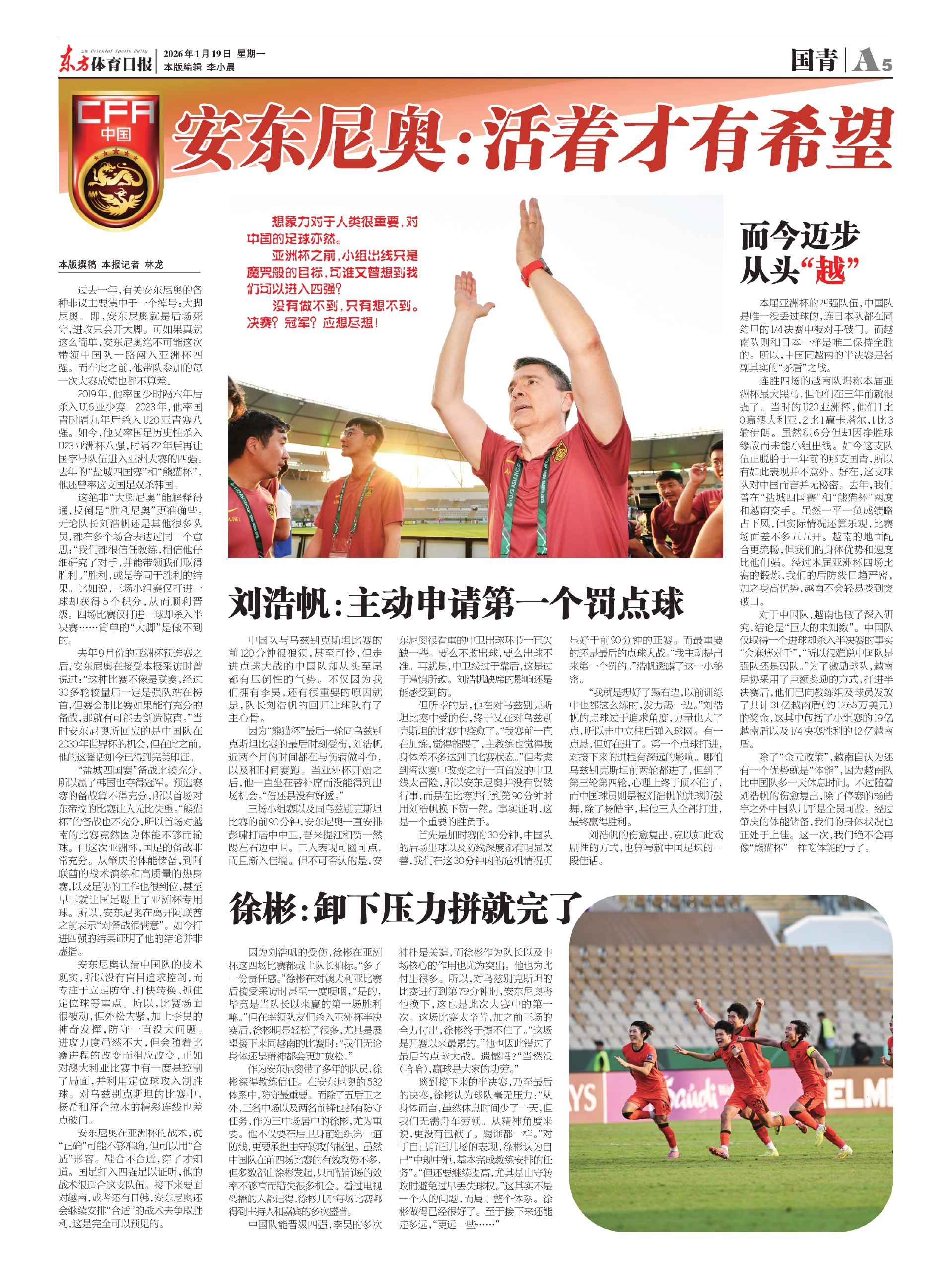 因为刘浩帆的受伤,徐彬在亚洲杯这四场比赛都戴上队长袖标。“多了一份责任感。”徐彬在对澳大利亚比赛后接受采访时甚至一度哽咽,“是的,毕竟是当队长以来赢的第一场胜利嘛。”但在率领队友们杀入亚洲杯半决赛后,徐彬明显轻松了很多,尤其是展望接下来同越南的比赛时:“我们无论身体还是精神都会更加放松。”