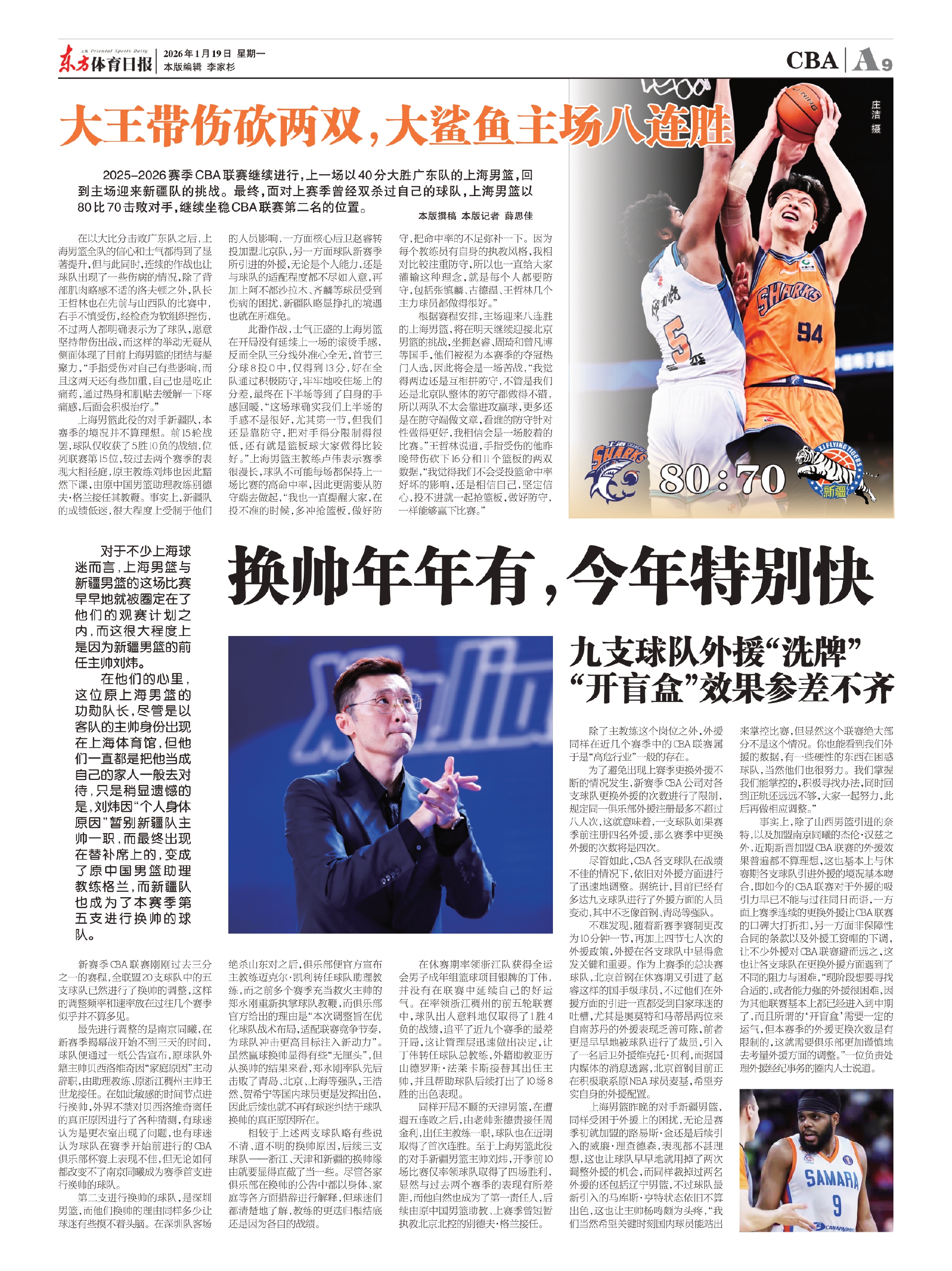 2025-2026赛季CBA联赛继续进行,上一场以40分大胜广东队的上海男篮,回到主场迎来新疆队的挑战。最终,面对上赛季曾经双杀过自己的球队,上海男篮以80比70击败对手,继续坐稳CBA联赛第二名的位置。