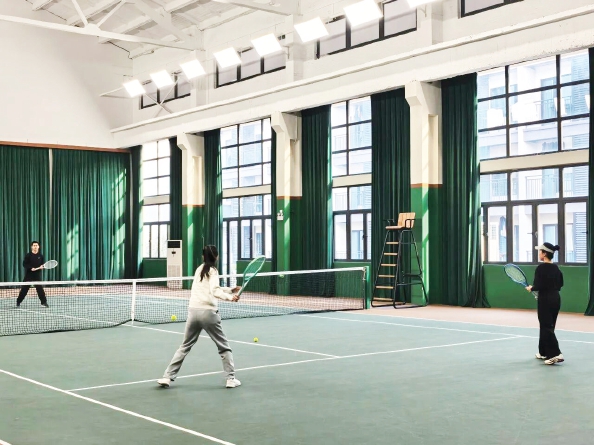 超岛内,复古风格的标准室内网球场为墨绿与锈红相间,悬于空中的金属灯架、斑驳墙面与专业运动地胶的并置,冷峻的工业感包裹着蒸腾的运动热情,形成了一种独特的“冲突美学”。网球馆层高超过10米,配备24盏防眩光专业灯,确保光照无影。值得一提的是,场馆还定期开放公益场时段,向周边学生、青年租户和居民敞开大门。此外,场馆内设有舒适整洁的休息区和配备充足热水的淋浴间,方便运动后小憩缓解疲劳、清洁放松。
