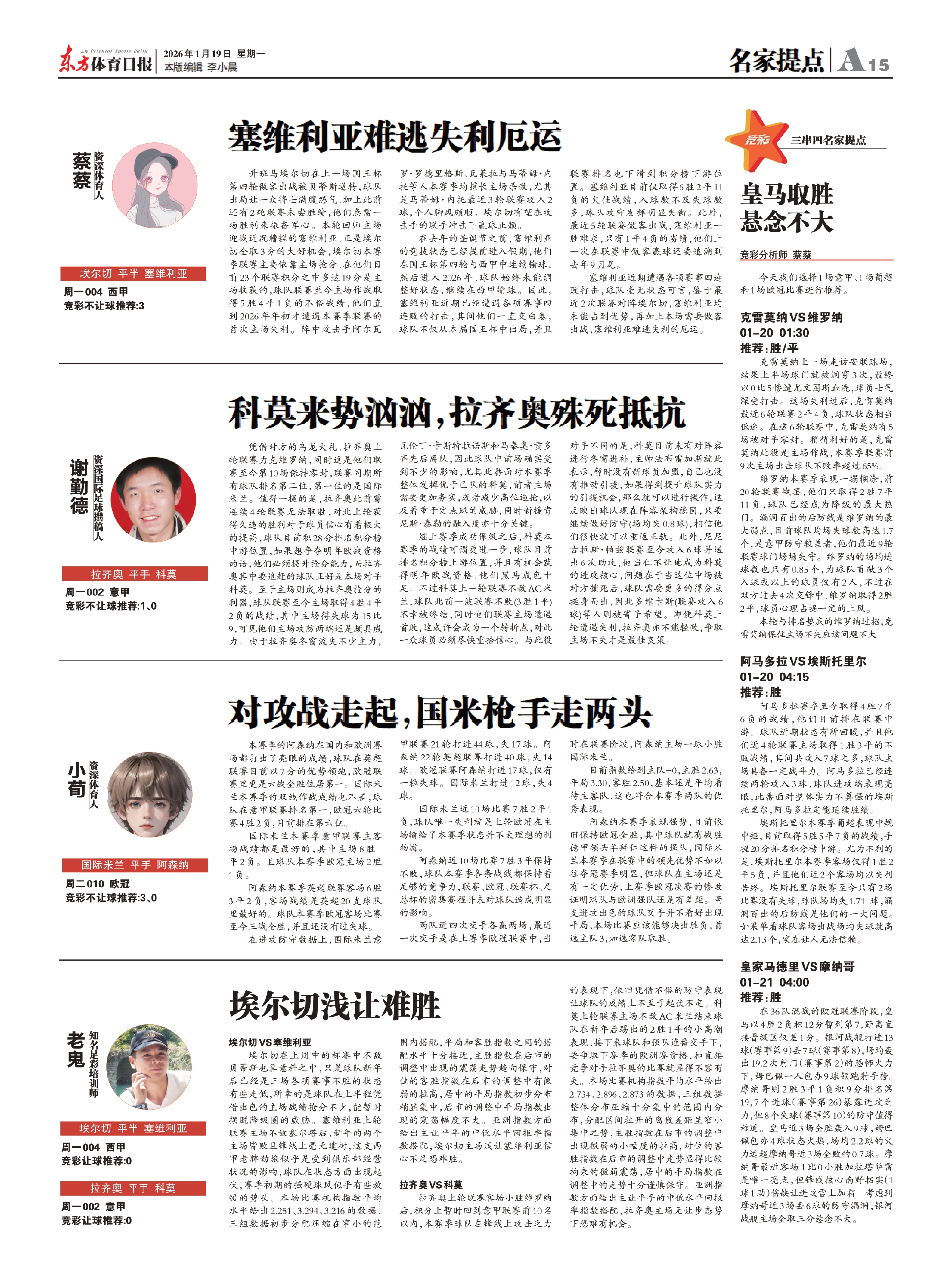 升班马埃尔切在上一场国王杯第四轮做客出战被贝蒂斯逆转,球队出局让一众将士满腹怨气,加上此前还有2轮联赛未尝胜绩,他们急需一场胜利来振奋军心。本轮回师主场迎战近况糟糕的塞维利亚,正是埃尔切全取3分的大好机会,埃尔切本赛季联赛主要依靠主场抢分,在他们目前23个联赛积分之中多达19分是主场收获的,球队联赛至今主场作战取得5胜4平1负的不俗战绩,他们直到2026年年初才遭遇本赛季联赛的首次主场失利。阵中攻击手阿尔瓦罗·罗德里格斯、瓦莱拉与马蒂姆·内托等人本赛季均擅长主场杀敌,尤其是马蒂姆·内托最近3轮联赛攻入2球,个人脚风颇顺。埃尔切有望在攻击手的联手冲击下赢球止颓。
