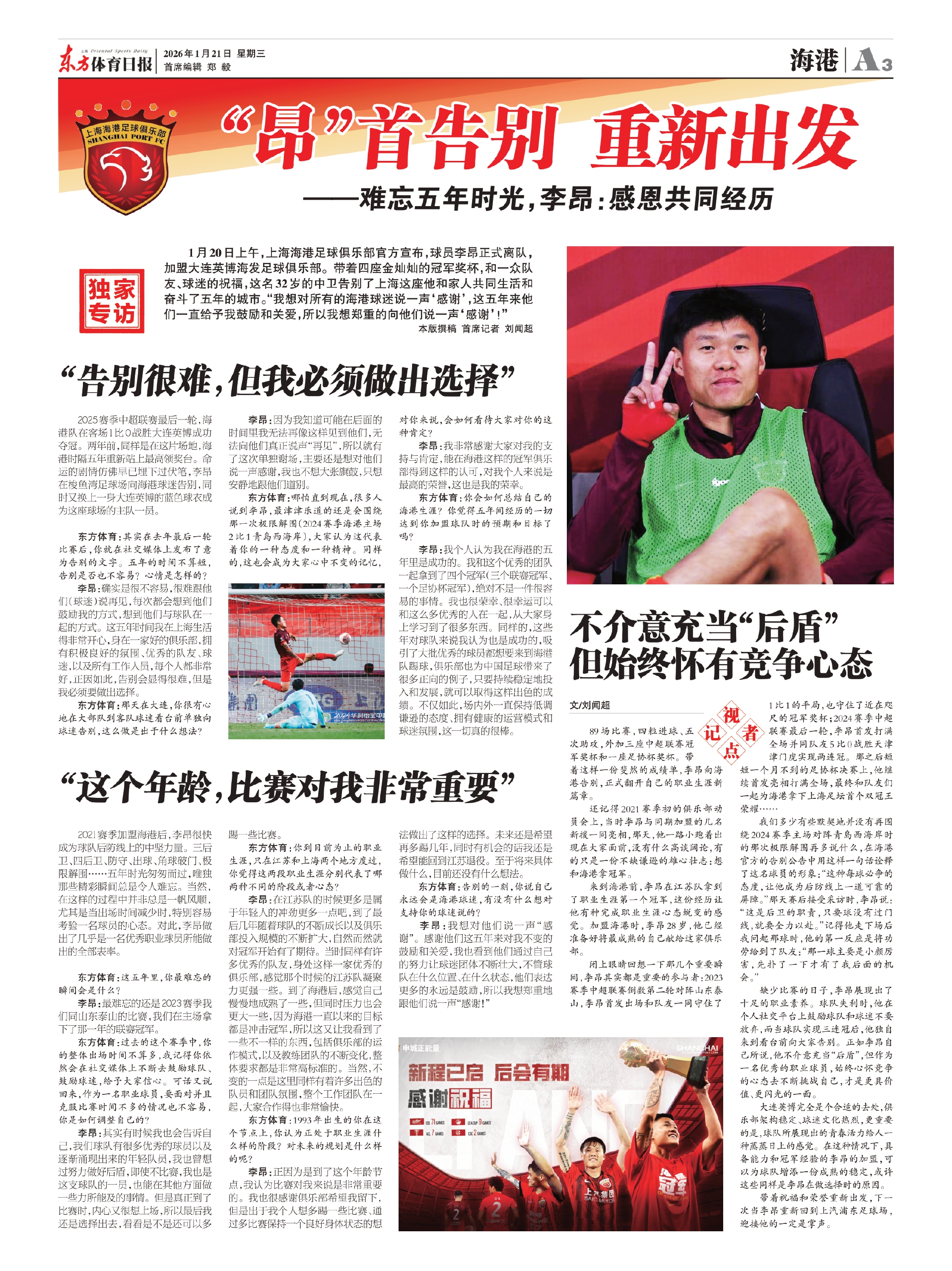 李昂:正因为是到了这个年龄节点,我认为比赛对我来说是非常重要的。我也很感谢俱乐部希望我留下,但是出于我个人想多踢一些比赛、通过多比赛保持一个良好身体状态的想法做出了这样的选择。未来还是希望再多踢几年,同时有机会的话我还是希望能回到江苏退役。至于将来具体做什么,目前还没有什么想法。