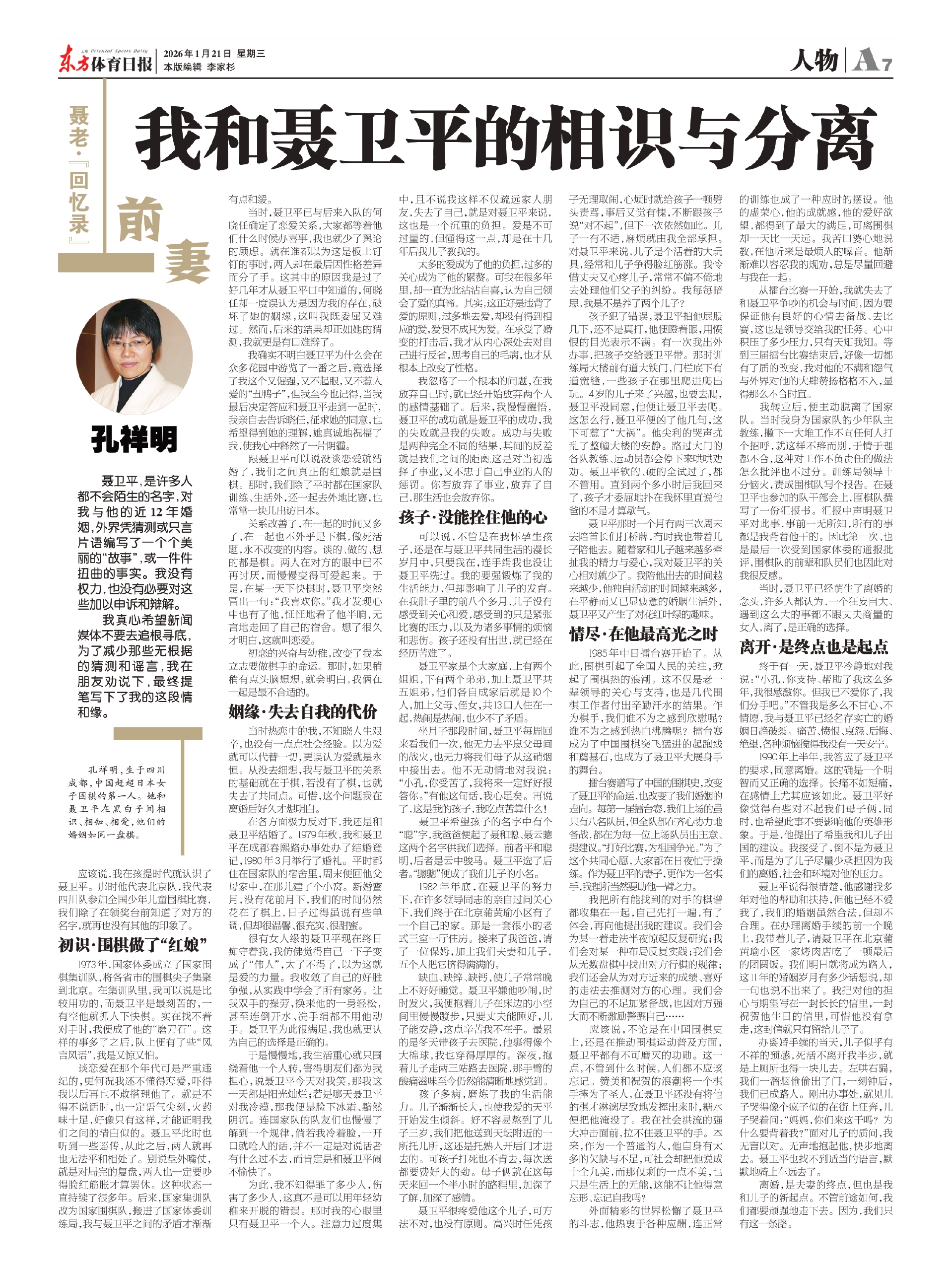 聂卫平,是许多人都不会陌生的名字,对我与他的近12年婚姻,外界凭猜测或只言片语编写了一个个美丽的“故事”,或一件件扭曲的事实。我没有权力,也没有必要对这些加以申诉和辩解。