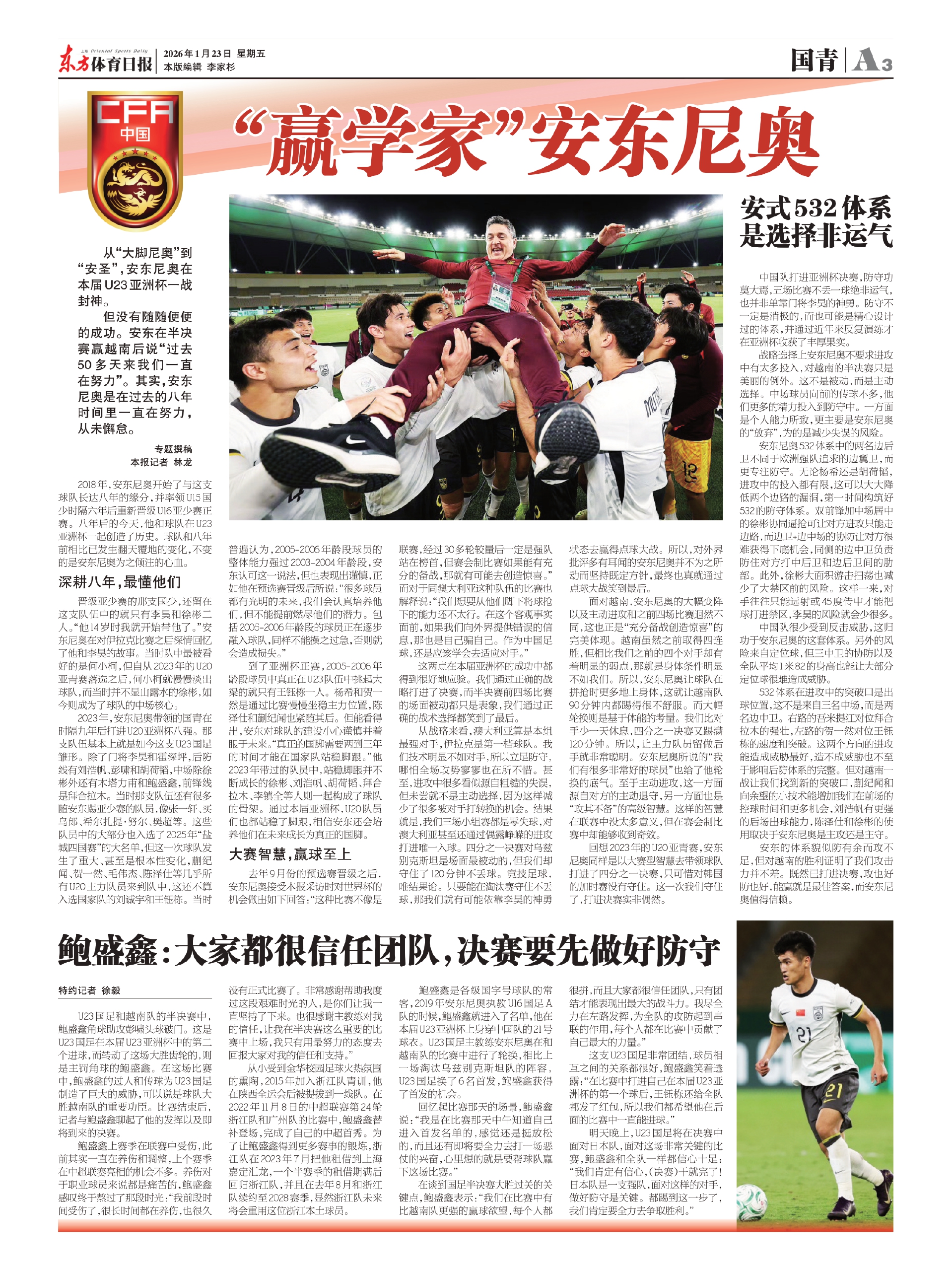 到了亚洲杯正赛,2005-2006年龄段球员中真正在U23队伍中挑起大梁的就只有王钰栋一人。杨希和贺一然是通过比赛慢慢坐稳主力位置,陈泽仕和蒯纪闻也紧随其后。但能看得出,安东对球队的建设小心谨慎并着眼于未来。“真正的国脚需要两到三年的时间才能在国家队站稳脚跟。”他2023年带过的队员中,站稳脚跟并不断成长的徐彬、刘浩帆、胡荷韬、拜合拉木、李镇全等人则一起构成了球队的骨架。通过本届亚洲杯,U20队员们也都站稳了脚跟,相信安东还会培养他们在未来成长为真正的国脚。
