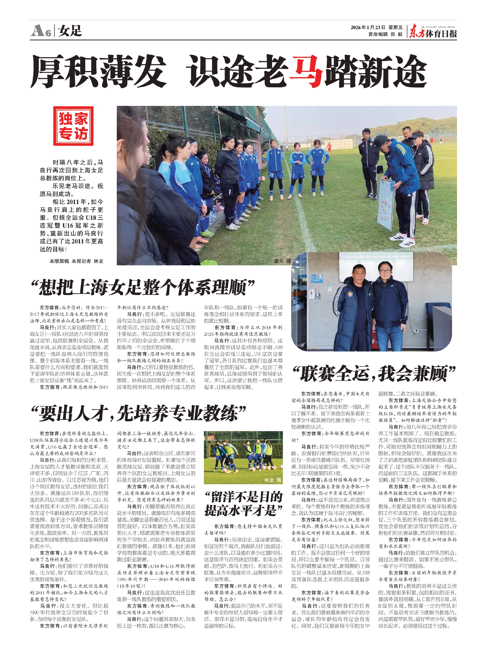 马良行:之所以要挂总教练的名,因为我一直想把上海女足的整个体系理顺。培养运动员需要一个体系。从区体校到市体校,再到我们这儿的青年队和一线队,如果有一个统一的训练理念和打法体系的要求,这样上来的就比较顺。