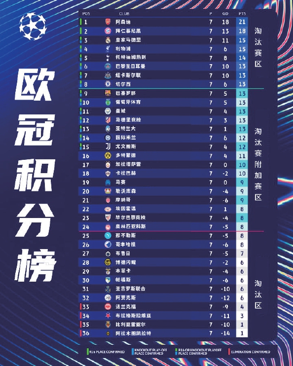 欧冠联赛阶段第7轮全部结束,拜仁2比0圣吉罗斯提前一轮拿到了直通资格,而阿森纳此前就已提前锁定出线资格,皇马、利物浦在本轮均取胜积15分,获得较大优势。热刺14分排在第5,大巴黎、纽卡、切尔西、巴萨等8支球队同积13分,显然末轮争夺将进入白热化