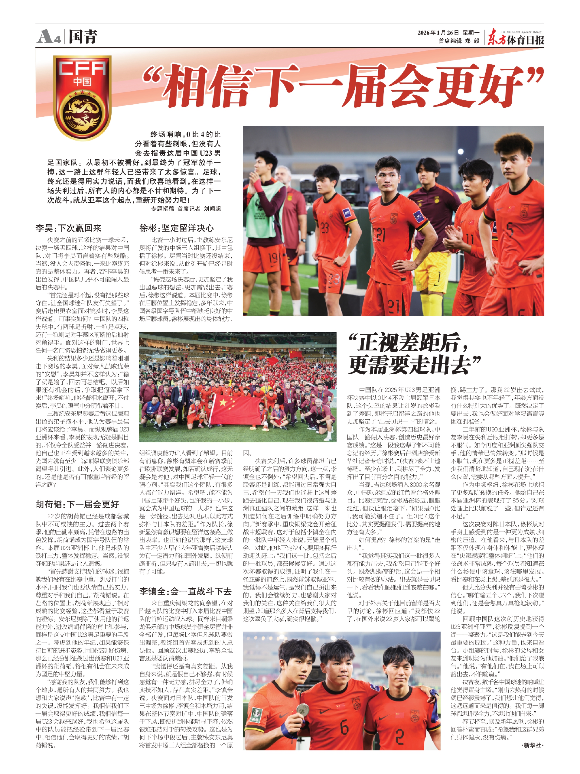 “感谢我的队友,我们能够打到这个地步,是所有人的共同努力。我也想和大家说声‘抱歉’,比赛中有一定的失误,没能发挥好。我相信我们下一届会取得更好的成绩,我相信每一届U23会越来越好,我也希望这届队中的队员能把经验带到下一届比赛中,相信他们会取得更好的成绩。”胡荷韬说。