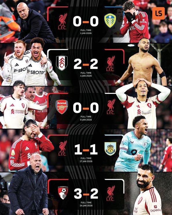 从去年9月27日第六轮客场1比2输给水晶宫开始,利物浦曾遭遇过一段10轮两胜两平六负的低谷期,还闹出了萨拉赫不满替补身份公开炮轰俱乐部与主教练的新闻,之后情况略有好转,连续击败布莱顿、热刺与狼队拿下三连胜,但从第18轮主场平利兹联开始,球队又陷入不胜怪圈,接下来连平富勒姆、阿森纳与伯恩利,本轮输给伯恩茅斯后,在2026年英超还没赢过。