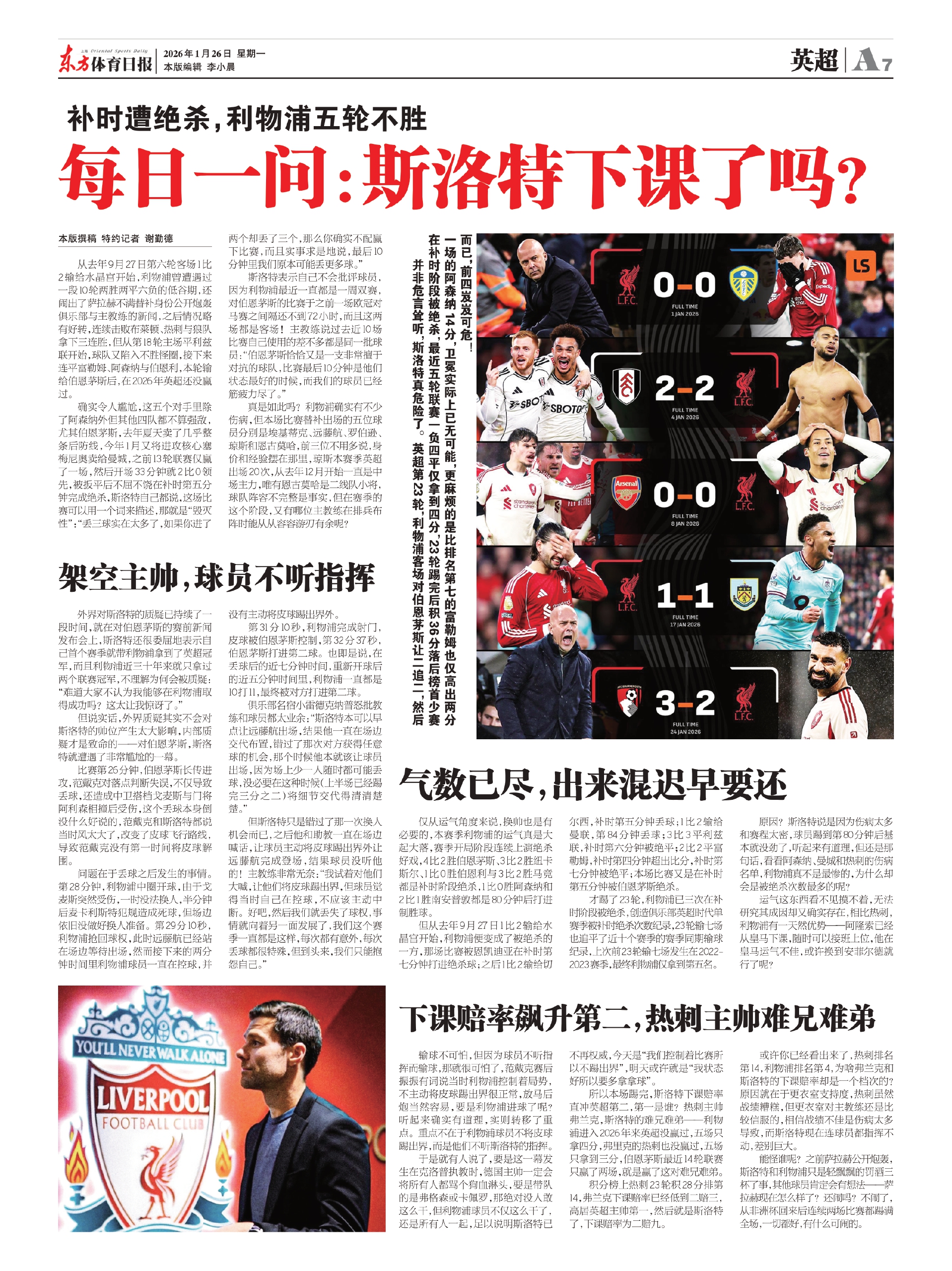 输球不可怕,但因为球员不听指挥而输球,那就很可怕了,范戴克赛后振振有词说当时利物浦控制着局势,不主动将皮球踢出界很正常,放马后炮当然容易,要是利物浦进球了呢?听起来确实有道理,实则转移了重点。重点不在于利物浦球员不将皮球踢出界,而是他们不听斯洛特的指挥。