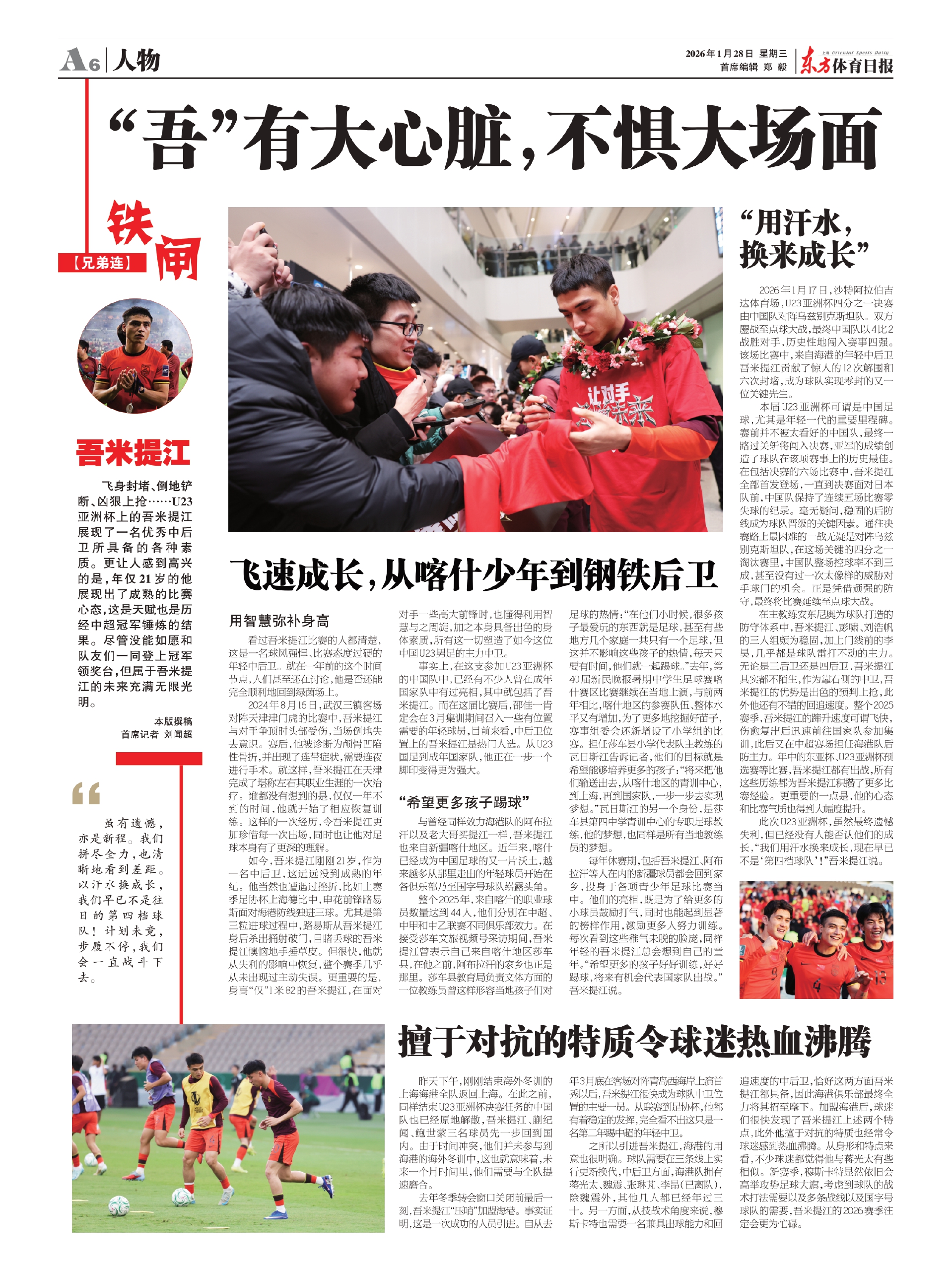 2026年1月17日,沙特阿拉伯吉达体育场,U23亚洲杯四分之一决赛由中国队对阵乌兹别克斯坦队。双方鏖战至点球大战,最终中国队以4比2战胜对手,历史性地闯入赛事四强。该场比赛中,来自海港的年轻中后卫吾米提江贡献了惊人的12次解围和六次封堵,成为球队实现零封的又一位关键先生。