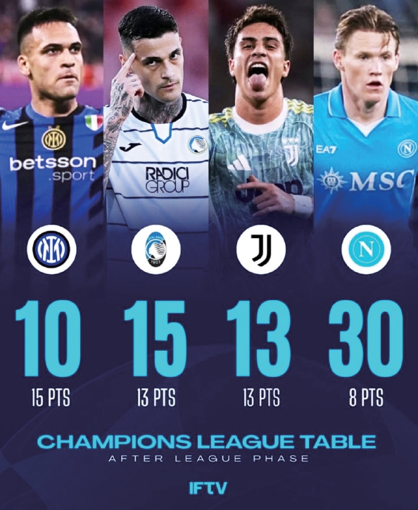 国际米兰、亚特兰大和尤文图斯踢附加赛,那不勒斯排名第30耻辱性出局,最弱的意甲冠军。孔蒂如愿以偿了,意大利球队的耻辱