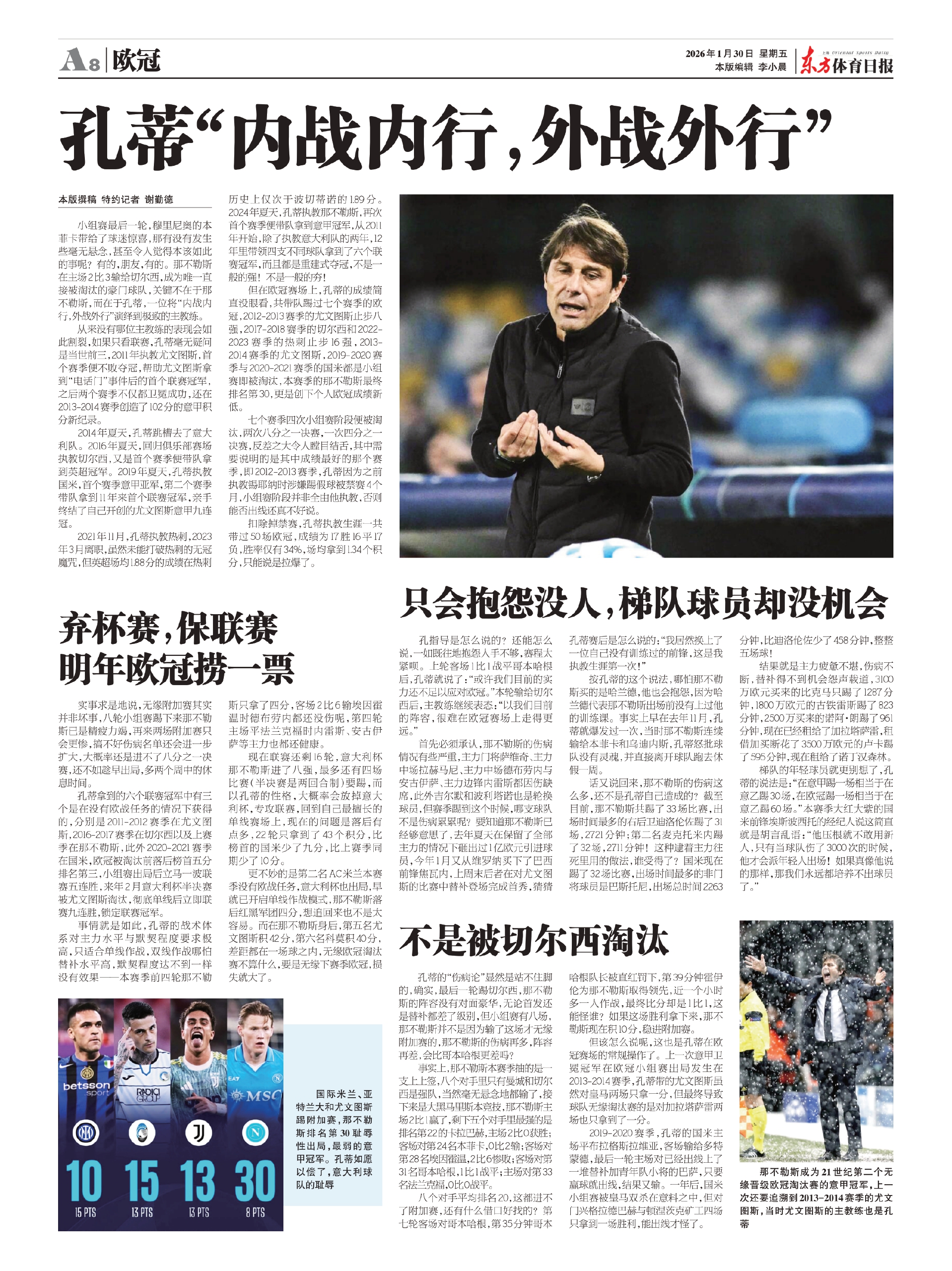 扣除掉禁赛,孔蒂执教生涯一共带过50场欧冠,成绩为17胜16平17负,胜率仅有34%,场均拿到1.34个积分,只能说是拉爆了。弃杯赛,保联赛明年欧冠捞一票