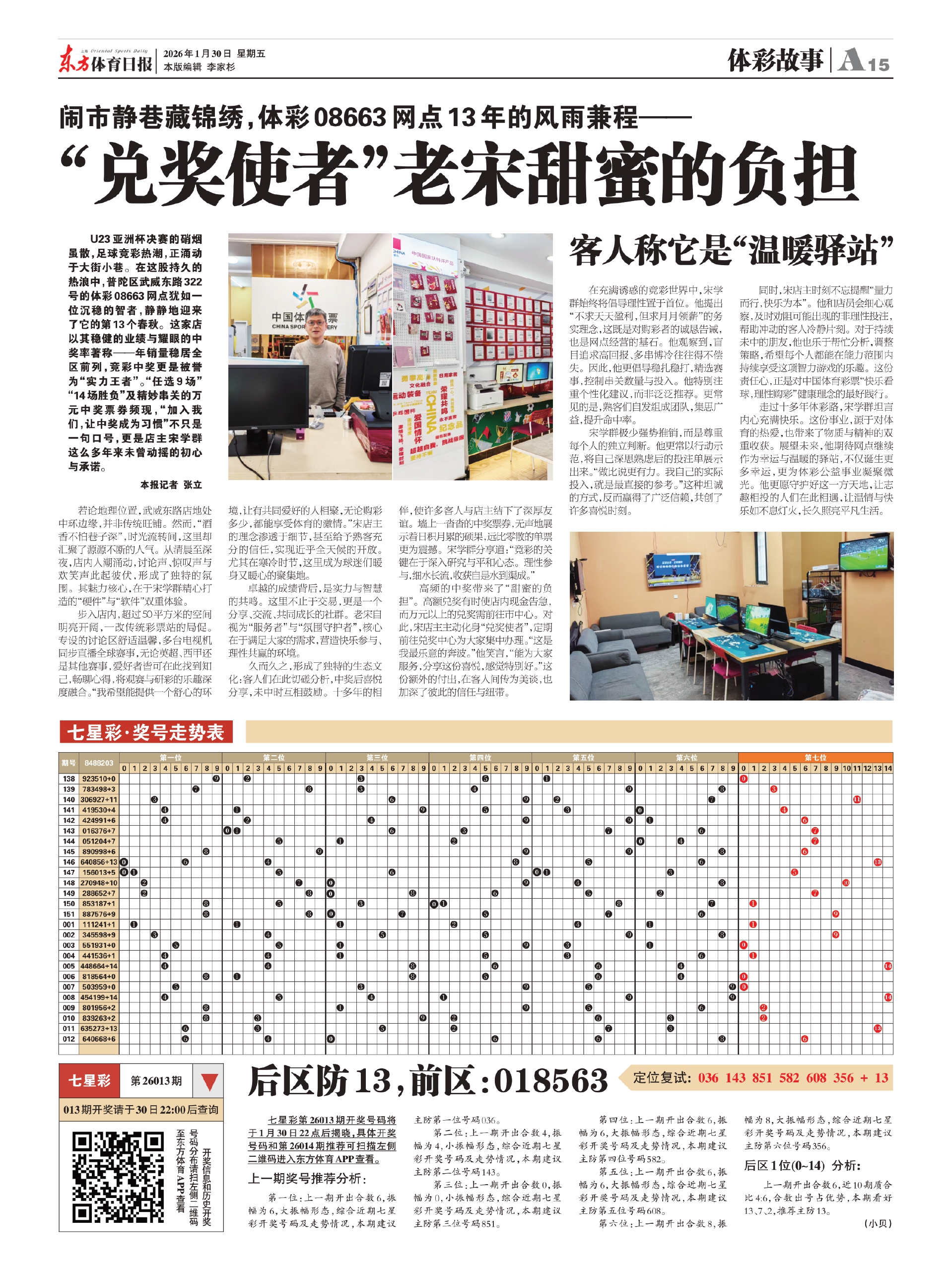 U23亚洲杯决赛的硝烟虽散,足球竞彩热潮,正涌动于大街小巷。在这股持久的热浪中,普陀区武威东路322号的体彩08663网点犹如一位沉稳的智者,静静地迎来了它的第13个春秋。这家店以其稳健的业绩与耀眼的中奖率著称——年销量稳居全区前列,竞彩中奖更是被誉为“实力王者”。“任选9场”“14场胜负”及精妙串关的万元中奖票券频现,“加入我们,让中奖成为习惯”不只是一句口号,更是店主宋学群这么多年来未曾动摇的初心与承诺。