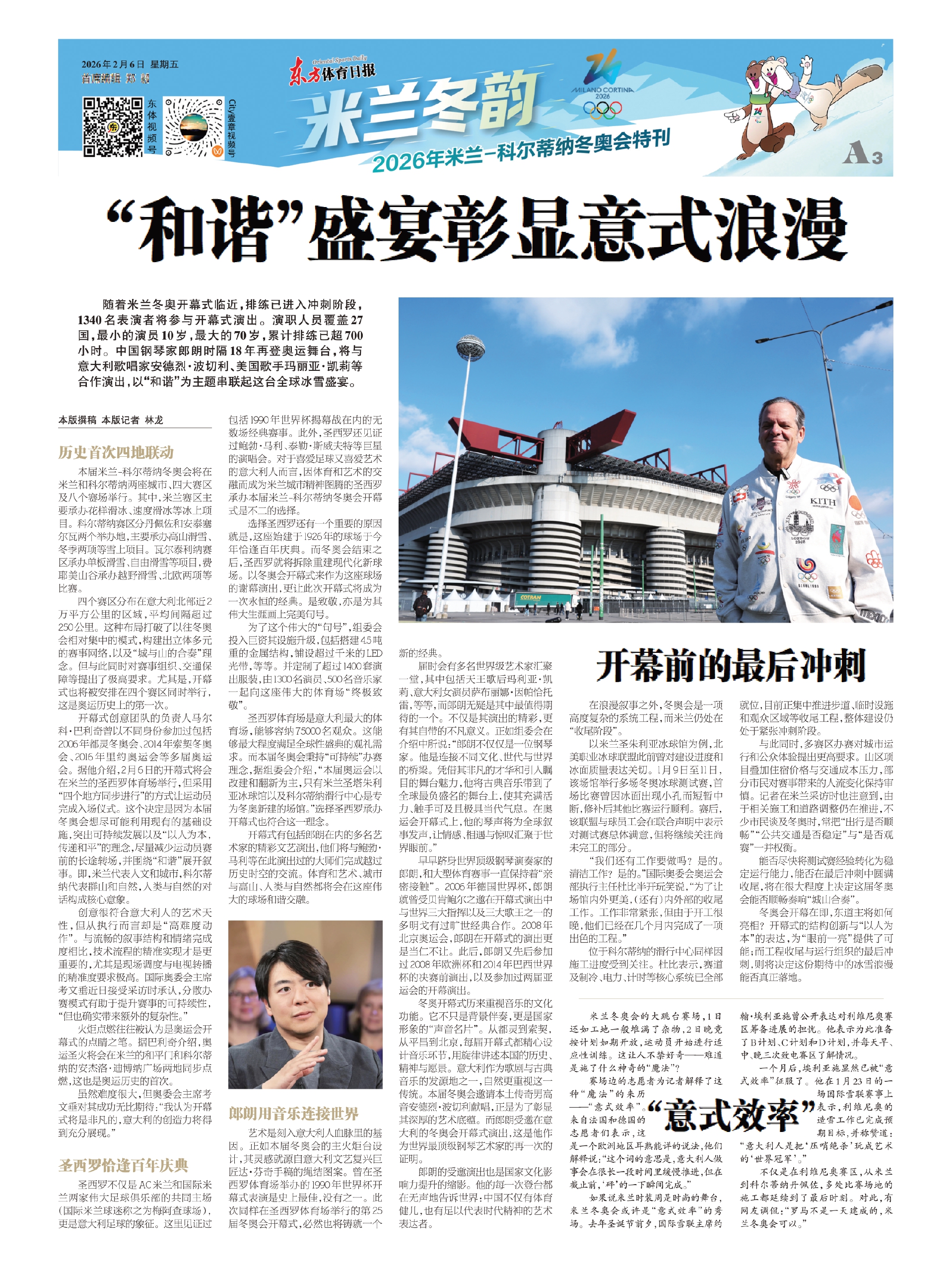 随着米兰冬奥开幕式临近,排练已进入冲刺阶段,1340名表演者将参与开幕式演出。演职人员覆盖27国,最小的演员10岁,最大的70岁,累计排练已超700小时。中国钢琴家郎朗时隔18年再登奥运舞台,将与意大利歌唱家安德烈·波切利、美国歌手玛丽亚·凯莉等合作演出,以“和谐”为主题串联起这台全球冰雪盛宴。