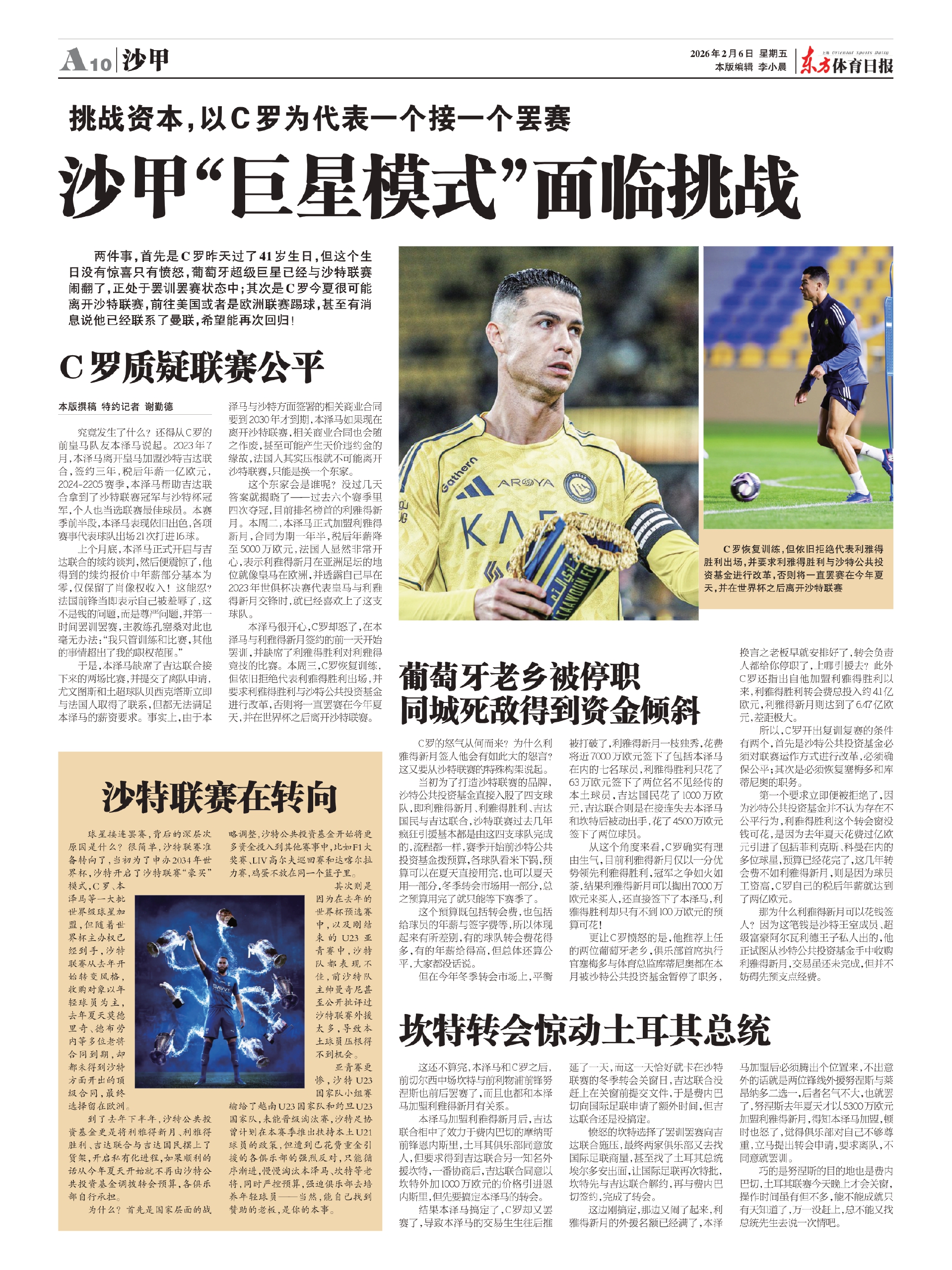 本泽马很开心,C罗却怒了,在本泽马与利雅得新月签约的前一天开始罢训,并缺席了利雅得胜利对利雅得竞技的比赛。本周三,C罗恢复训练,但依旧拒绝代表利雅得胜利出场,并要求利雅得胜利与沙特公共投资基金进行改革,否则将一直罢赛在今年夏天,并在世界杯之后离开沙特联赛。