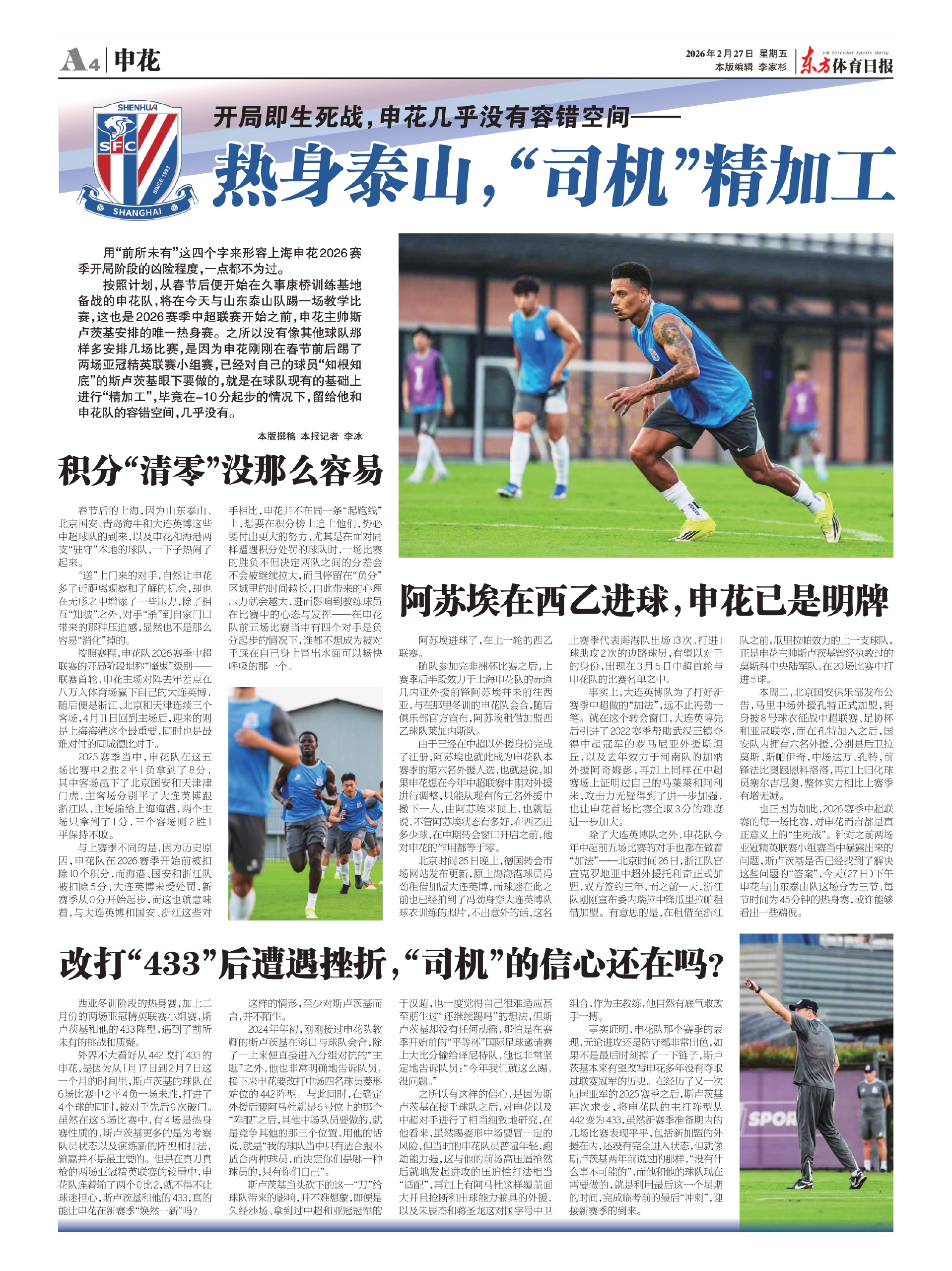 按照计划,从春节后便开始在久事康桥训练基地备战的申花队,将在今天与山东泰山队踢一场教学比赛,这也是2026赛季中超联赛开始之前,申花主帅斯卢茨基安排的唯一热身赛。之所以没有像其他球队那样多安排几场比赛,是因为申花刚刚在春节前后踢了两场亚冠精英联赛小组赛,已经对自己的球员“知根知底”的斯卢茨基眼下要做的,就是在球队现有的基础上进行“精加工”,毕竟在-10分起步的情况下,留给他和申花队的容错空间,几乎没有。