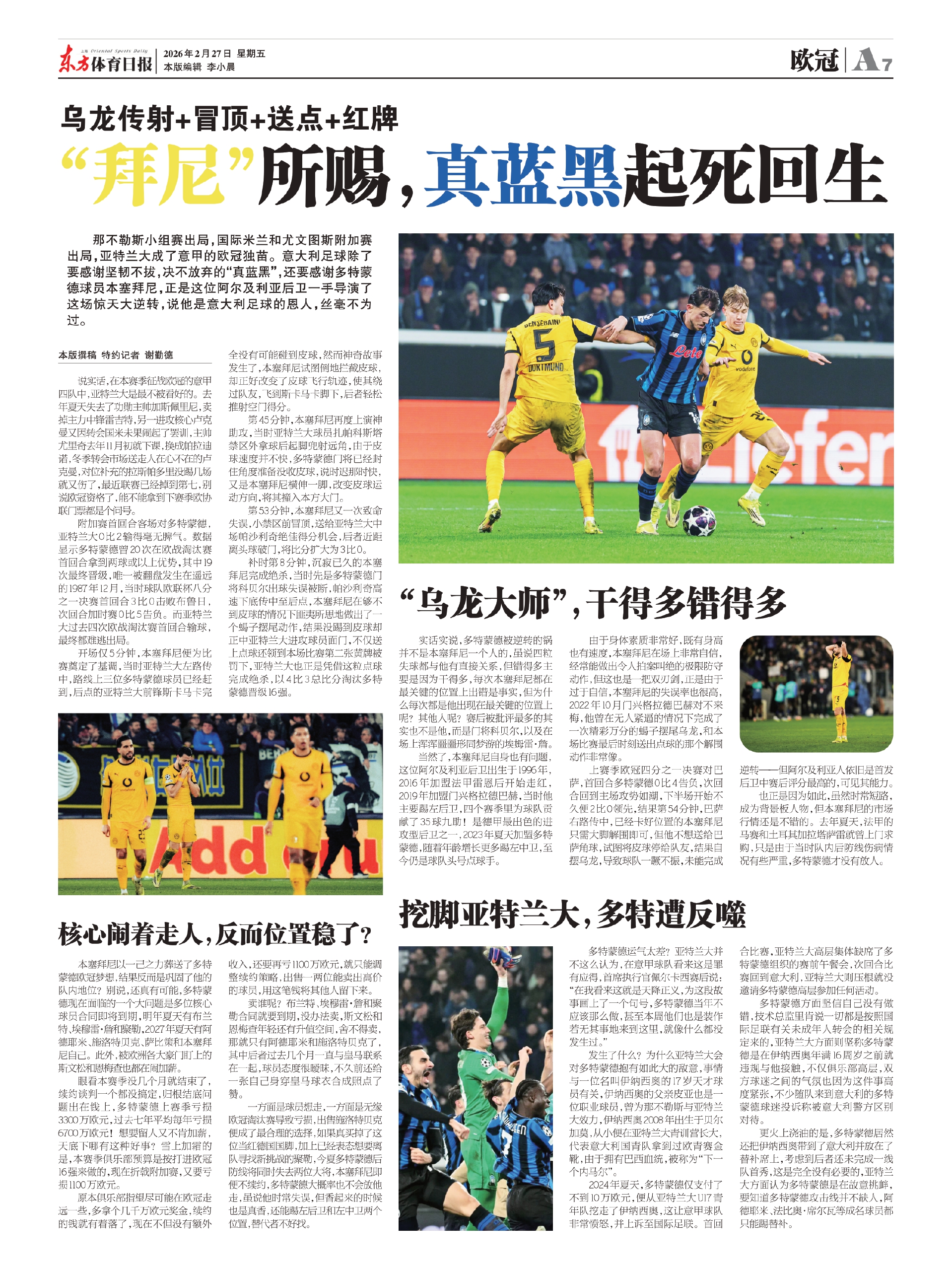 那不勒斯小组赛出局,国际米兰和尤文图斯附加赛出局,亚特兰大成了意甲的欧冠独苗。意大利足球除了要感谢坚韧不拔,决不放弃的“真蓝黑”,还要感谢多特蒙德球员本塞拜尼,正是这位阿尔及利亚后卫一手导演了这场惊天大逆转,说他是意大利足球的恩人,丝毫不为过。