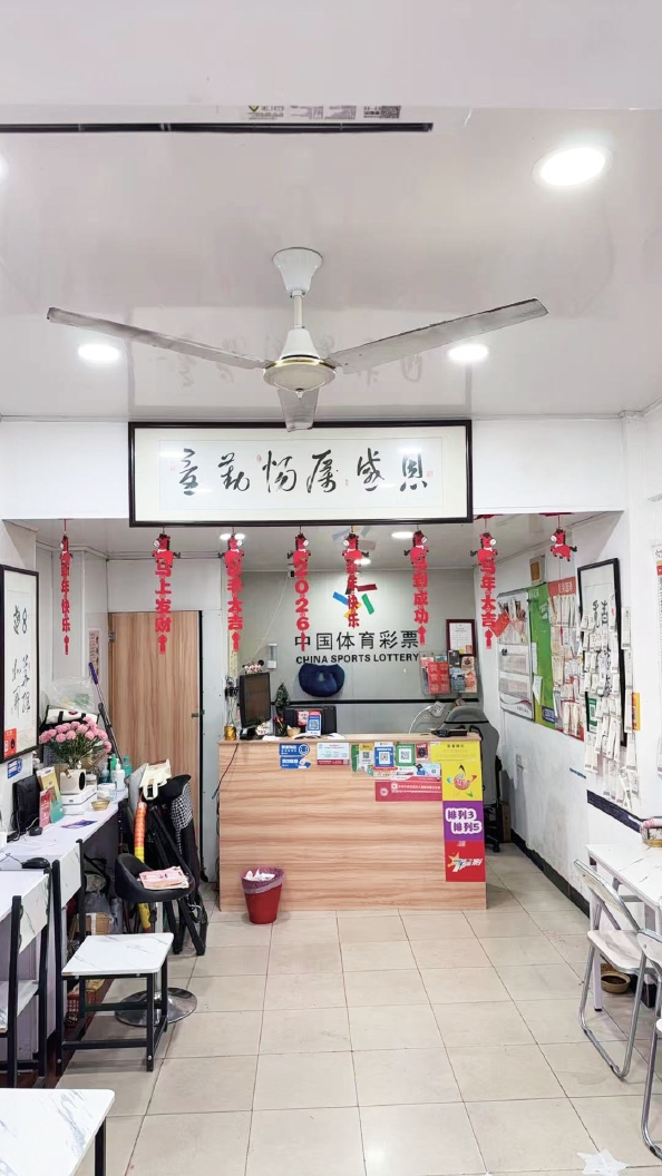 欧阳路地处上海老城区,两旁梧桐成荫,生活气息浓郁。葛文的体彩店格外好认,醒目的体彩标志旁,便是周边居民熟知的“社区驿站”。店面虽仅三十余平方米,却布置得雅致温馨:四面墙上悬挂着书法作品,笔走龙蛇间平添几分书卷气;液晶大电视实时播放球赛,电脑终端运行流畅,软硬件配置堪比商务休息室。