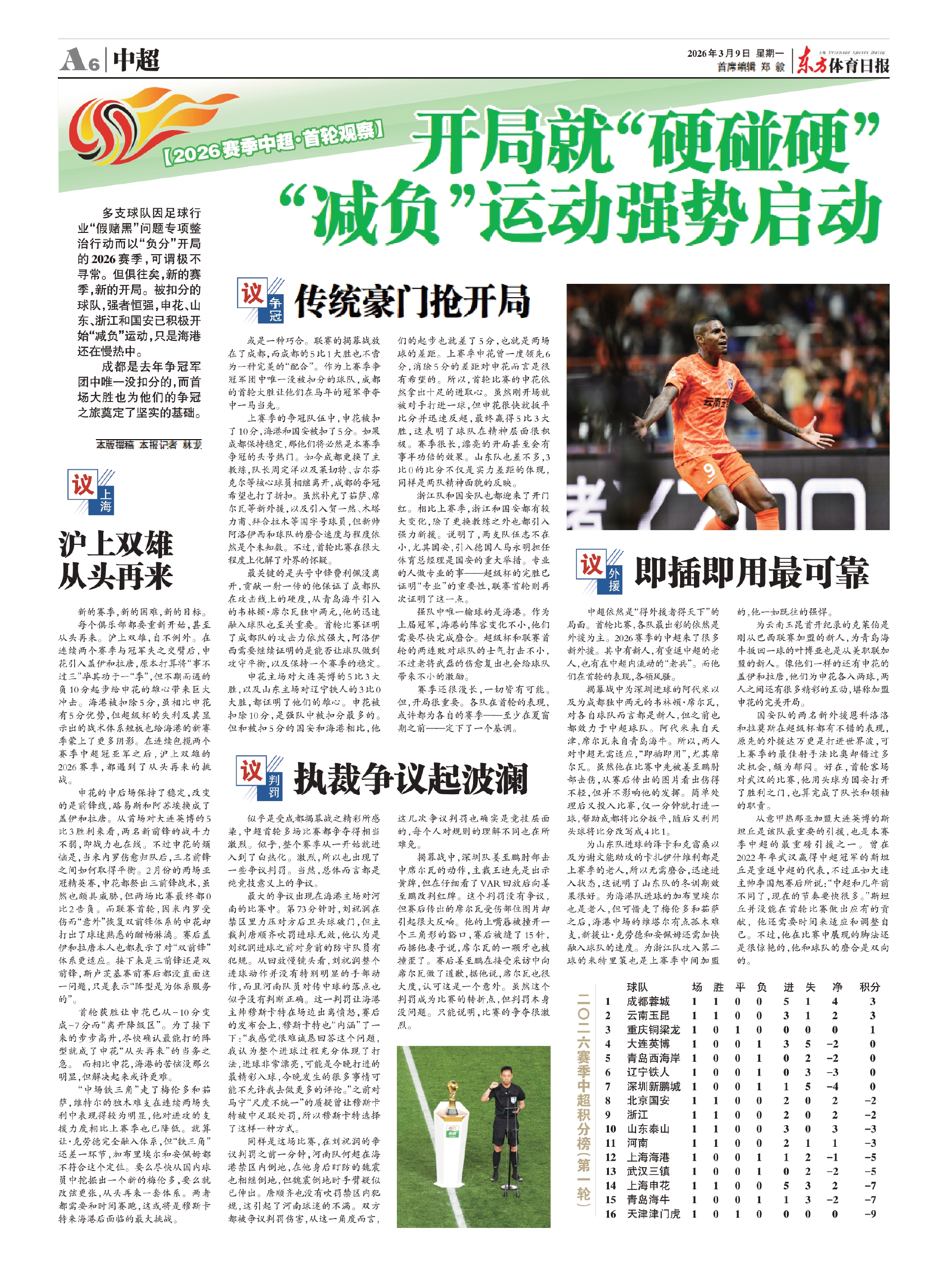 多支球队因足球行业“假赌黑”问题专项整治行动而以“负分”开局的2026赛季,可谓极不寻常。但俱往矣,新的赛季,新的开局。被扣分的球队,强者恒强,申花、山东、浙江和国安已积极开始“减负”运动,只是海港还在慢热中。
