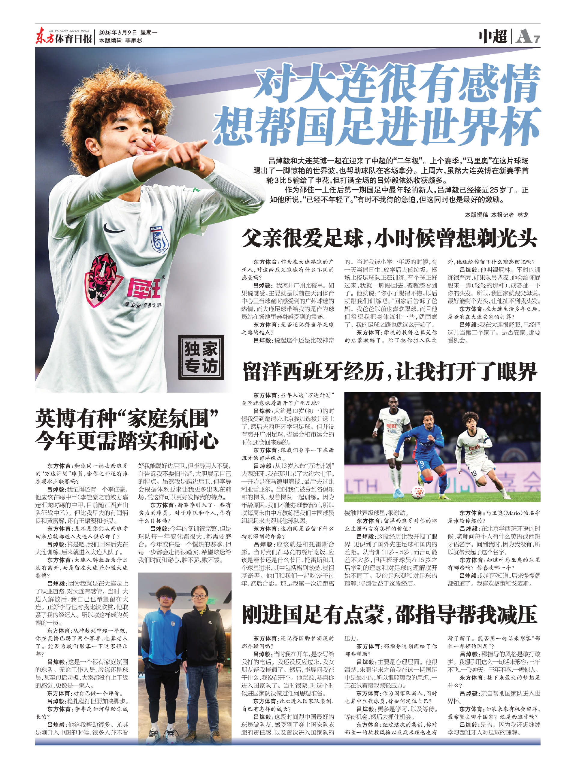 吕焯毅和大连英博一起在迎来了中超的“二年级”。上个赛季,“马里奥”在这片球场踢出了一脚惊艳的世界波,也帮助球队在客场拿分。上周六,虽然大连英博在新赛季首轮3比5输给了申花,但打满全场的吕焯毅依然收获颇多。