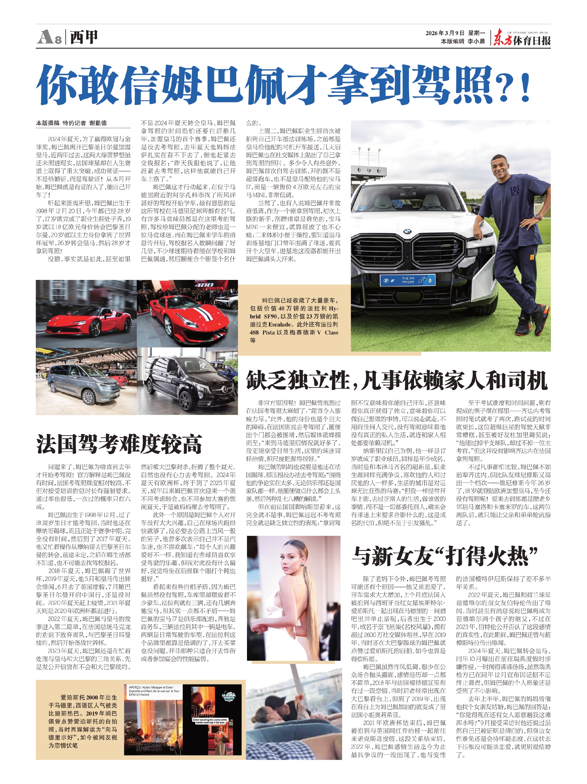 除了老妈下令外,姆巴佩考驾照可能还有个原因——他又谈恋爱了,开车需求大大增加,上个月底法国人被拍到与西班牙当红女星埃斯特尔·爱珀斯托一起出现在马德里的一间酒吧里并举止亲昵,后者出生于2000年,成名于奈飞剧集《名校风暴》,拥有超过2600万社交媒体粉丝,早在2019年,当时还在大巴黎踢球的姆巴佩就点赞过爱珀斯托的自拍,如今也算是得偿所愿。