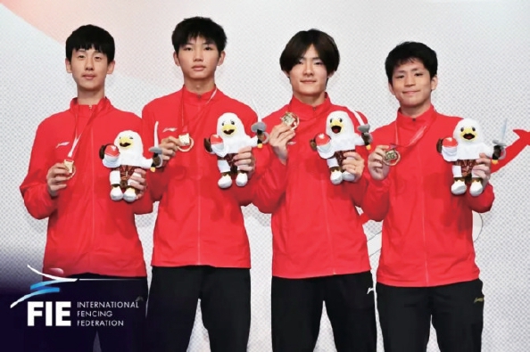 在有18支队参加的青年组男子花剑团体赛中,由吕惟乔和队友郭一凡、林炜乐、邹天一组成的中国队在分别击败卡塔尔队、中国澳门队和新加坡队后成功晋级决赛。决赛中,中国队与日本队战况激烈,比分交替上升,常规时间战成43平。加时赛里,中国队主动出击一剑制胜,夺得冠军。