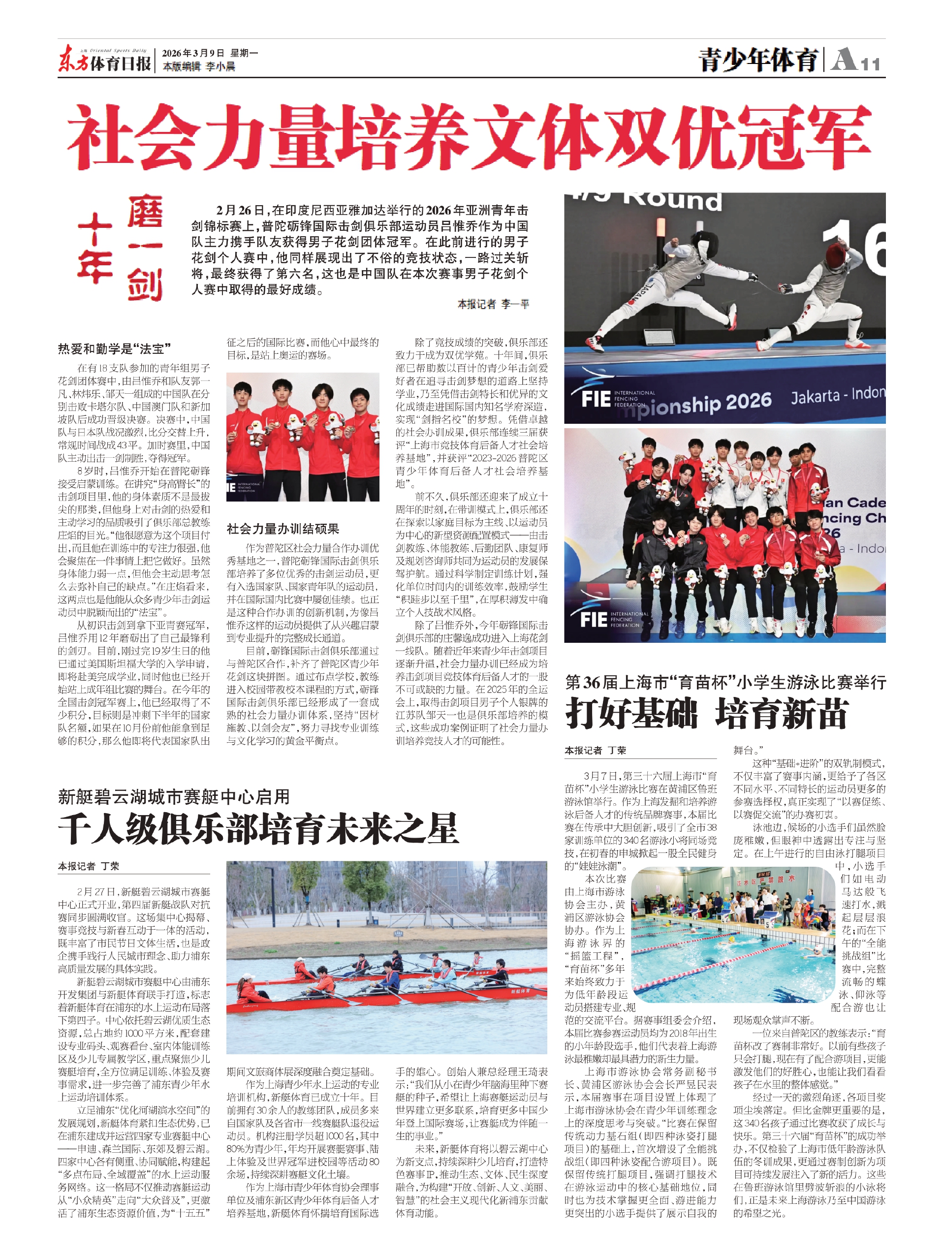 2月26日,在印度尼西亚雅加达举行的2026年亚洲青年击剑锦标赛上,普陀砺锋国际击剑俱乐部运动员吕惟乔作为中国队主力携手队友获得男子花剑团体冠军。在此前进行的男子花剑个人赛中,他同样展现出了不俗的竞技状态,一路过关斩将,最终获得了第六名,这也是中国队在本次赛事男子花剑个人赛中取得的最好成绩。