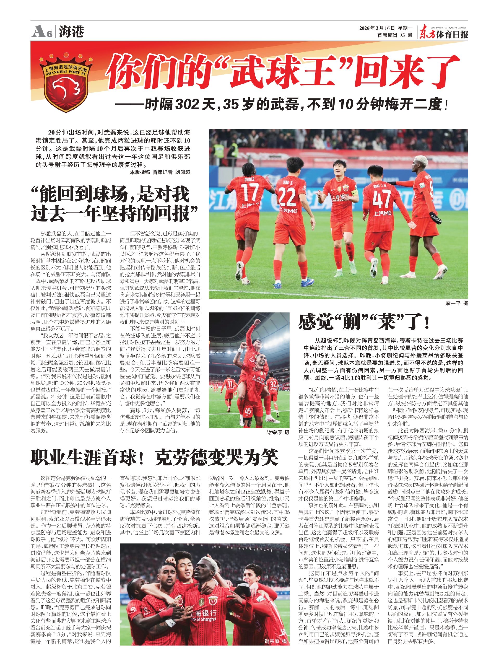 20分钟出场时间,对武磊来说,这已经足够他帮助海港锁定胜局了。甚至,他完成两粒进球的耗时还不到10分钟。这是武磊时隔10个月后再次于中超赛场收获进球,从时间跨度就能看出过去这一年这位国足和俱乐部的头号射手经历了怎样艰辛的康复过程。