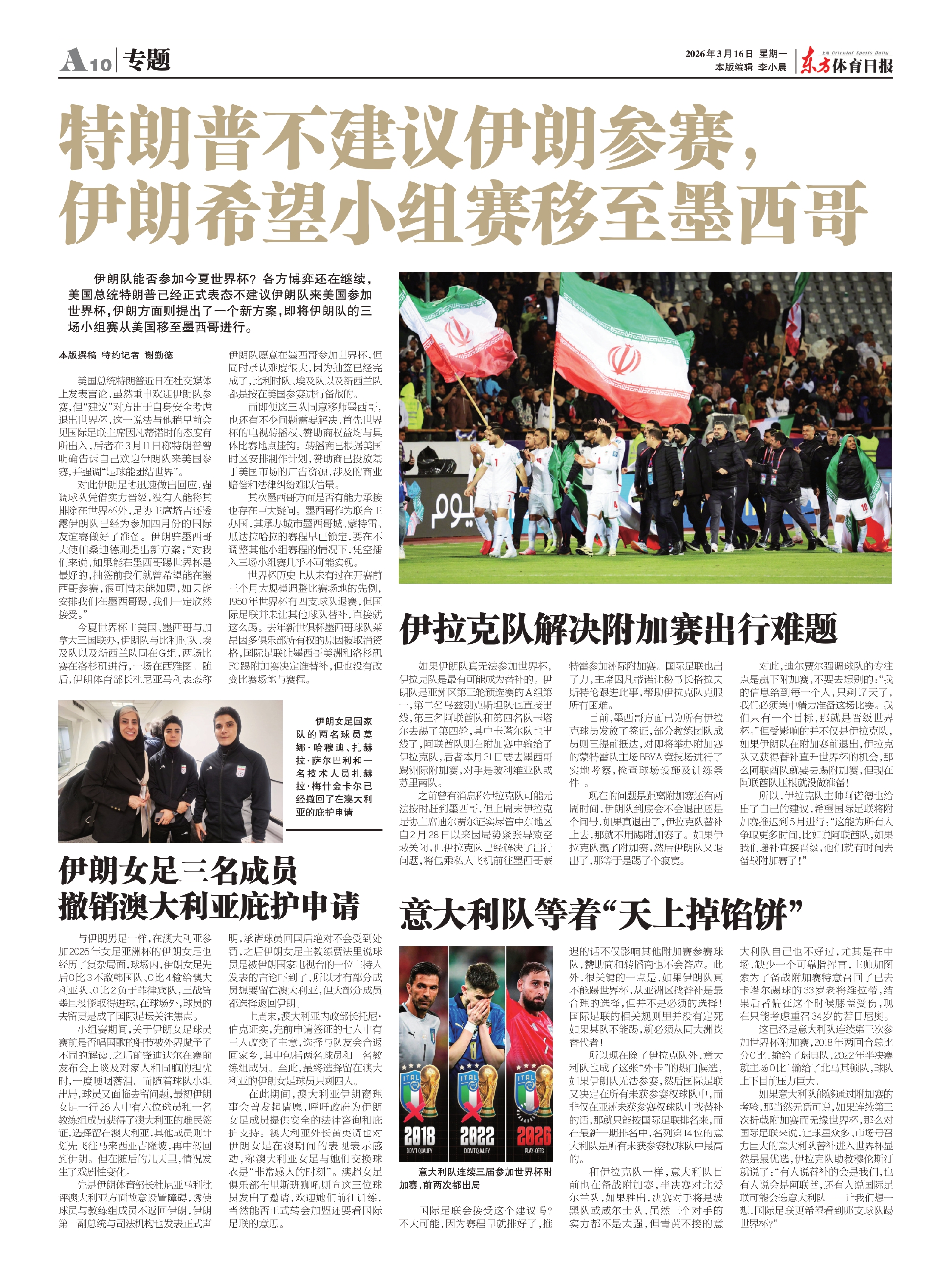 今夏世界杯由美国、墨西哥与加拿大三国联办,伊朗队与比利时队、埃及队以及新西兰队同在G组,两场比赛在洛杉矶进行,一场在西雅图。随后,伊朗体育部长杜尼亚马利表态称伊朗队愿意在墨西哥参加世界杯,但同时承认难度很大,因为抽签已经完成了,比利时队、埃及队以及新西兰队都是按在美国参赛进行备战的。