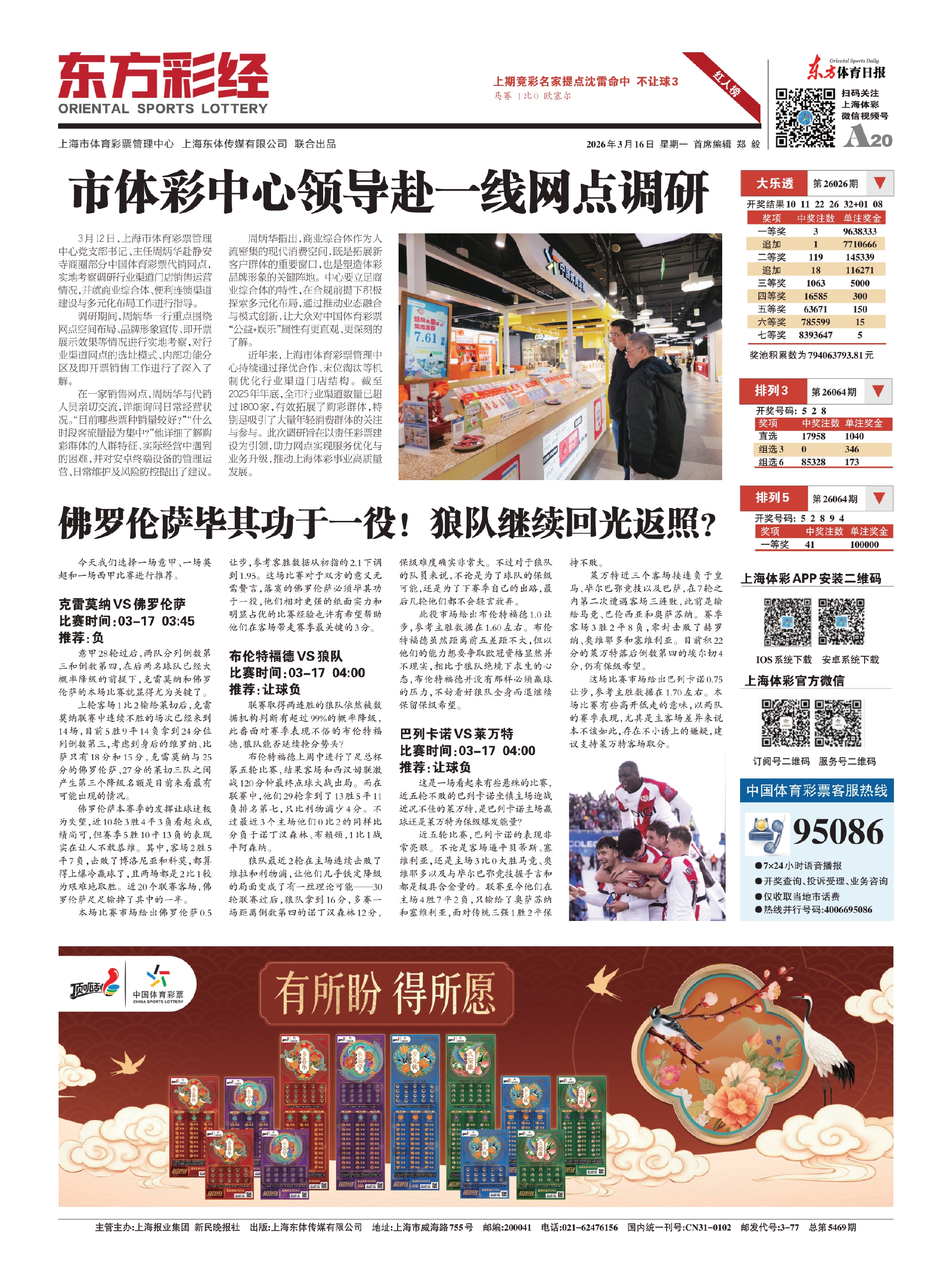 3月12日,上海市体育彩票管理中心党支部书记、主任周炳华赴静安寺商圈部分中国体育彩票代销网点,实地考察调研行业渠道门店销售运营情况,并就商业综合体、便利连锁渠道建设与多元化布局工作进行指导。
