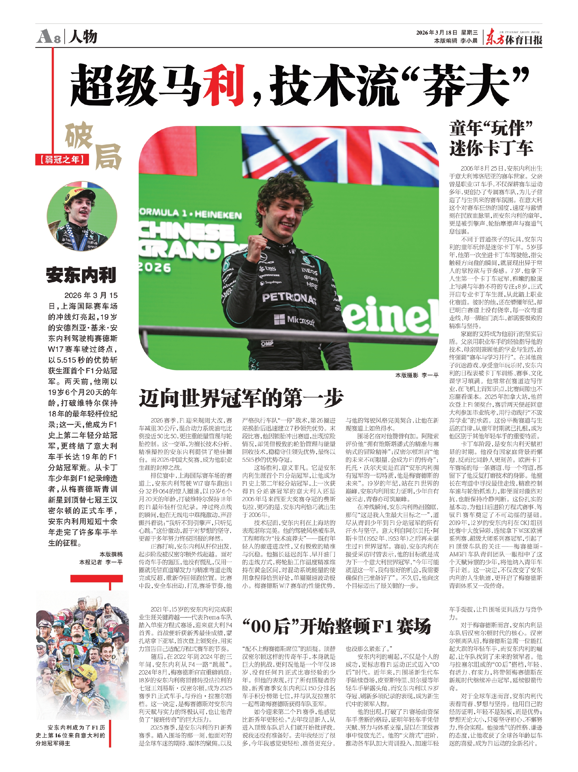 2026年3月15日,上海国际赛车场的冲线灯亮起,19岁的安德烈亚·基米·安东内利驾驶梅赛德斯W17赛车驶过终点,以5.515秒的优势斩获生涯首个F1分站冠军。两天前,他刚以19岁6个月20天的年龄,打破维特尔保持18年的最年轻杆位纪录;这一天,他成为F1史上第二年轻分站冠军,更终结了意大利车手长达19年的F1分站冠军荒。从卡丁车少年到F1纪录缔造者,从梅赛德斯青训新星到顶替七冠王汉密尔顿的正式车手,安东内利用短短十余年走完了许多车手半生的征程。
