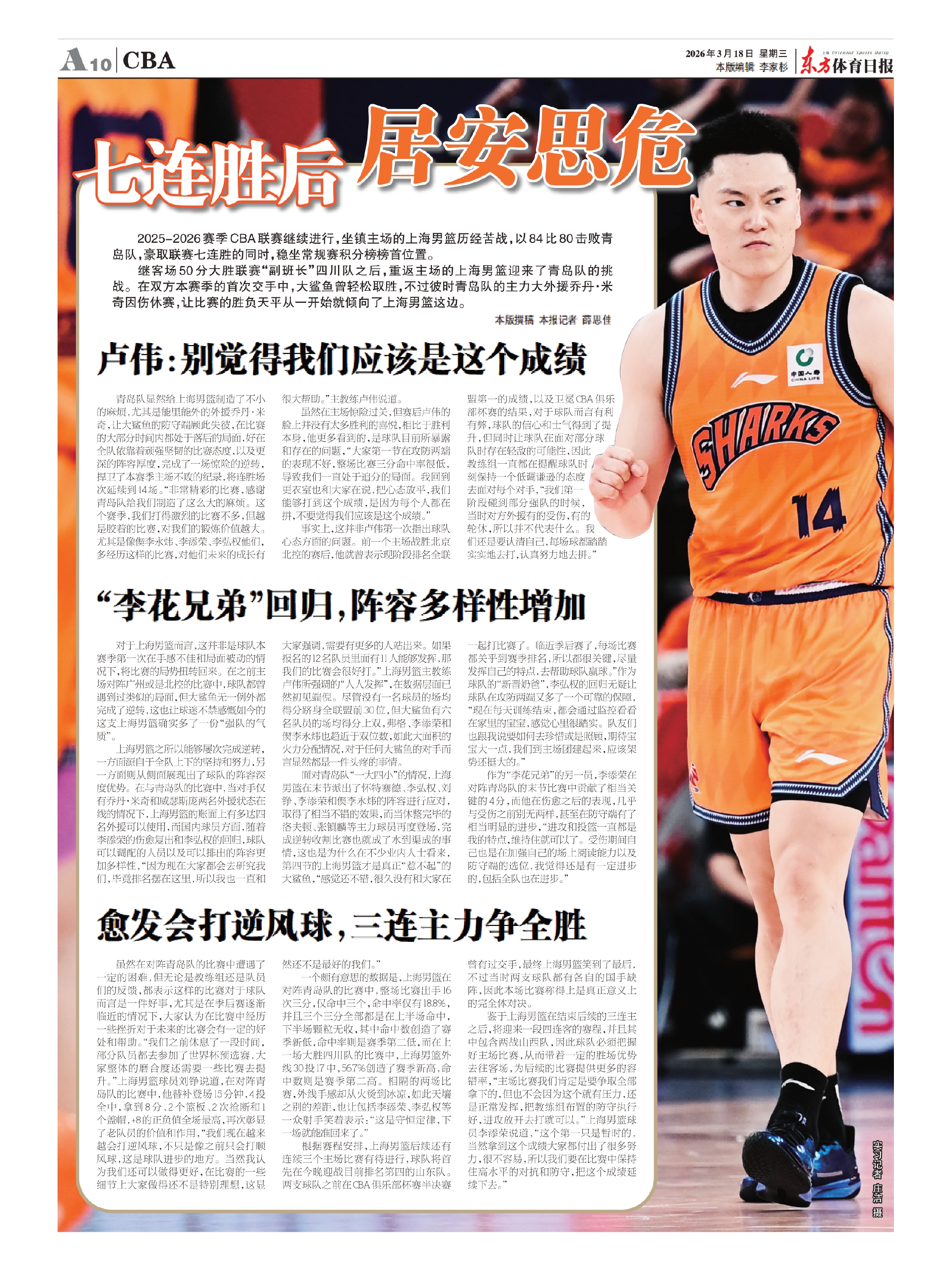 青岛队显然给上海男篮制造了不小的麻烦,尤其是能里能外的外援乔丹·米奇,让大鲨鱼的防守端顾此失彼,在比赛的大部分时间内都处于落后的局面,好在全队依靠着顽强坚韧的比赛态度,以及更深的阵容厚度,完成了一场惊险的逆转,捍卫了本赛季主场不败的纪录,将连胜场次延续到14场。“非常精彩的比赛,感谢青岛队给我们制造了这么大的麻烦。这个赛季,我们打得激烈的比赛不多,但越是胶着的比赛,对我们的锻炼价值越大。尤其是像偰李永炜、李添荣、李弘权他们,多经历这样的比赛,对他们未来的成长有很大帮助。”主教练卢伟说道。
