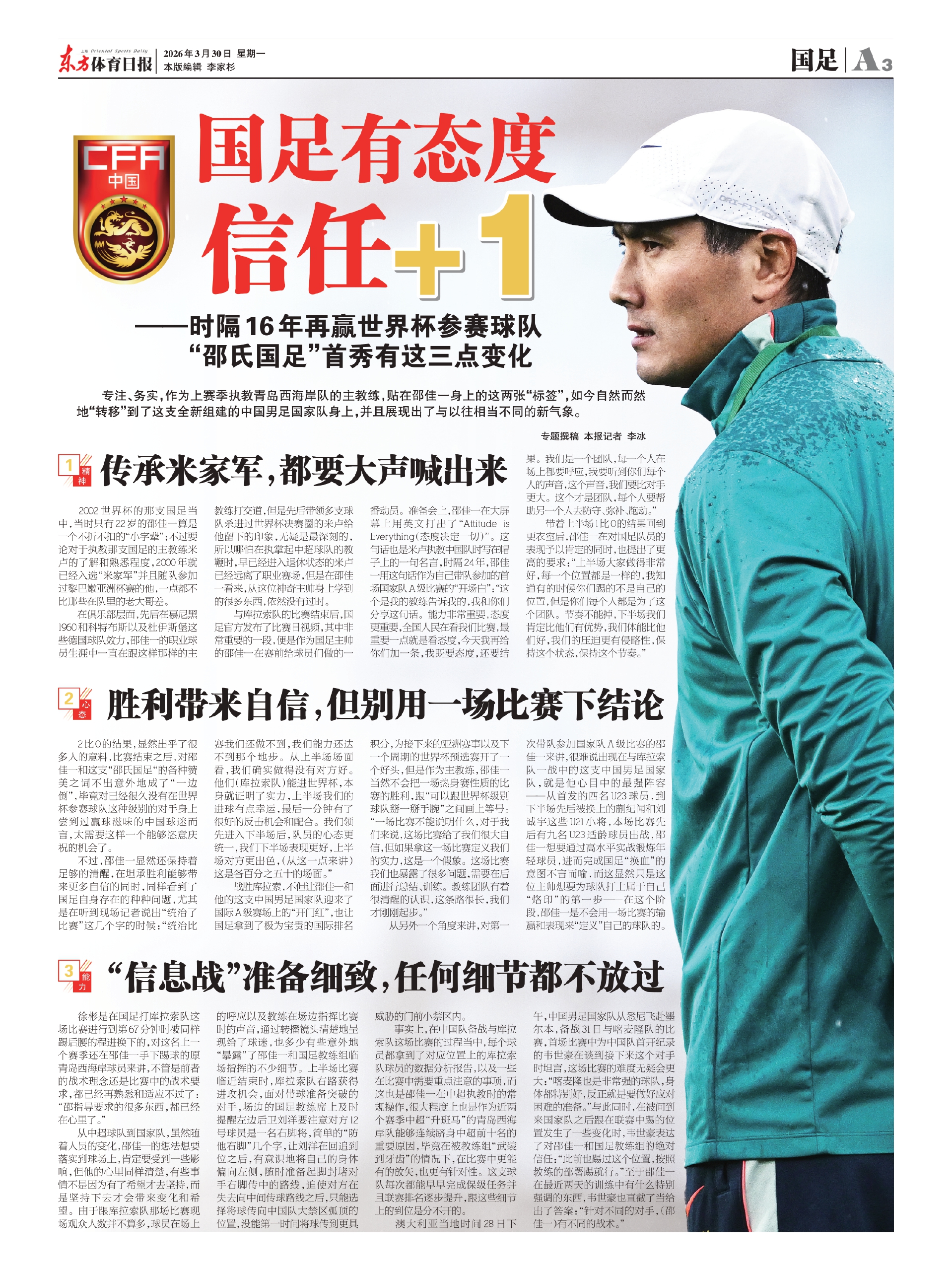 专注、务实,作为上赛季执教青岛西海岸队的主教练,贴在邵佳一身上的这两张“标签”,如今自然而然地“转移”到了这支全新组建的中国男足国家队身上,并且展现出了与以往相当不同的新气象。