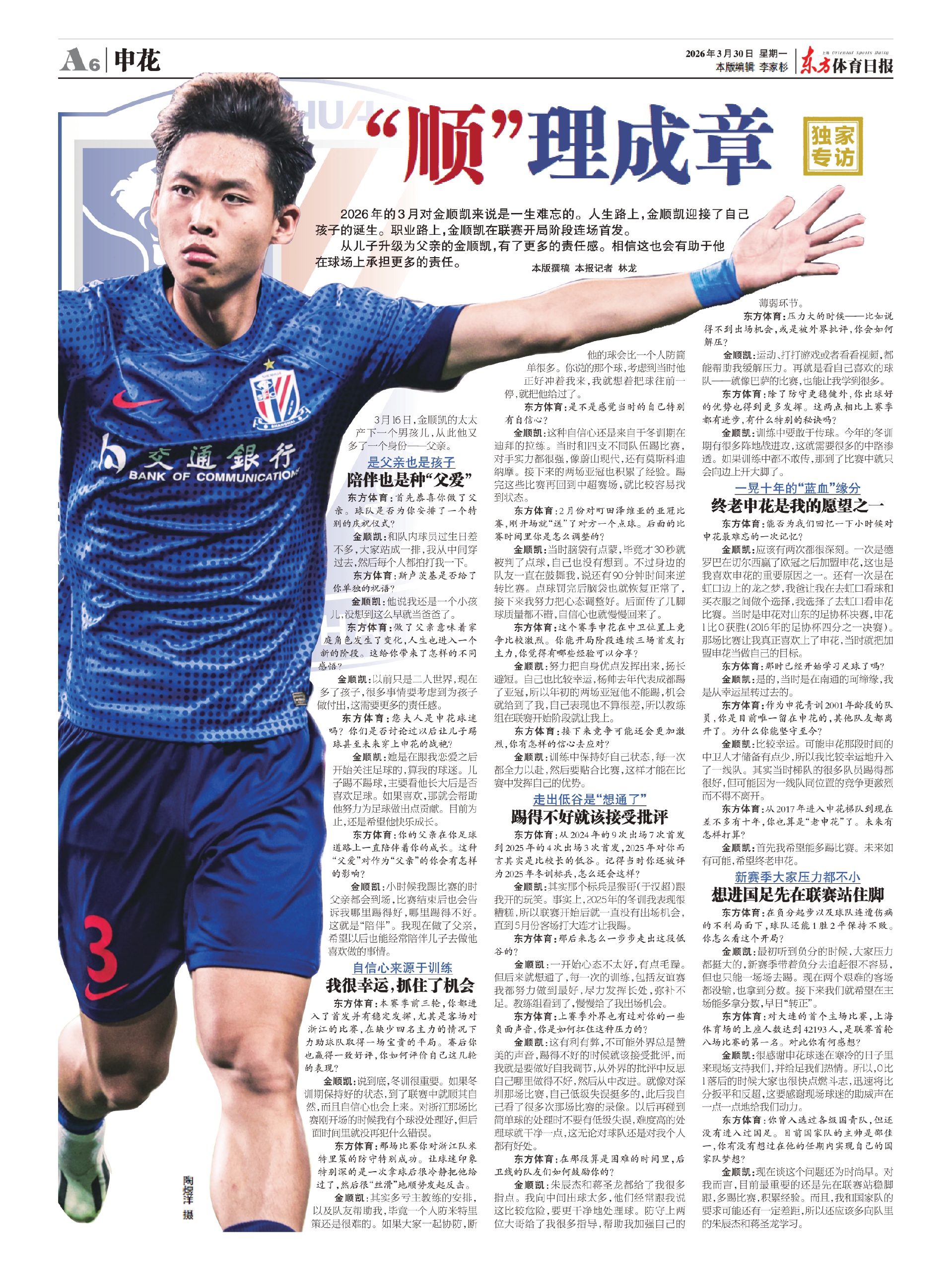 2026年的3月对金顺凯来说是一生难忘的。人生路上,金顺凯迎接了自己孩子的诞生。职业路上,金顺凯在联赛开局阶段连场首发。