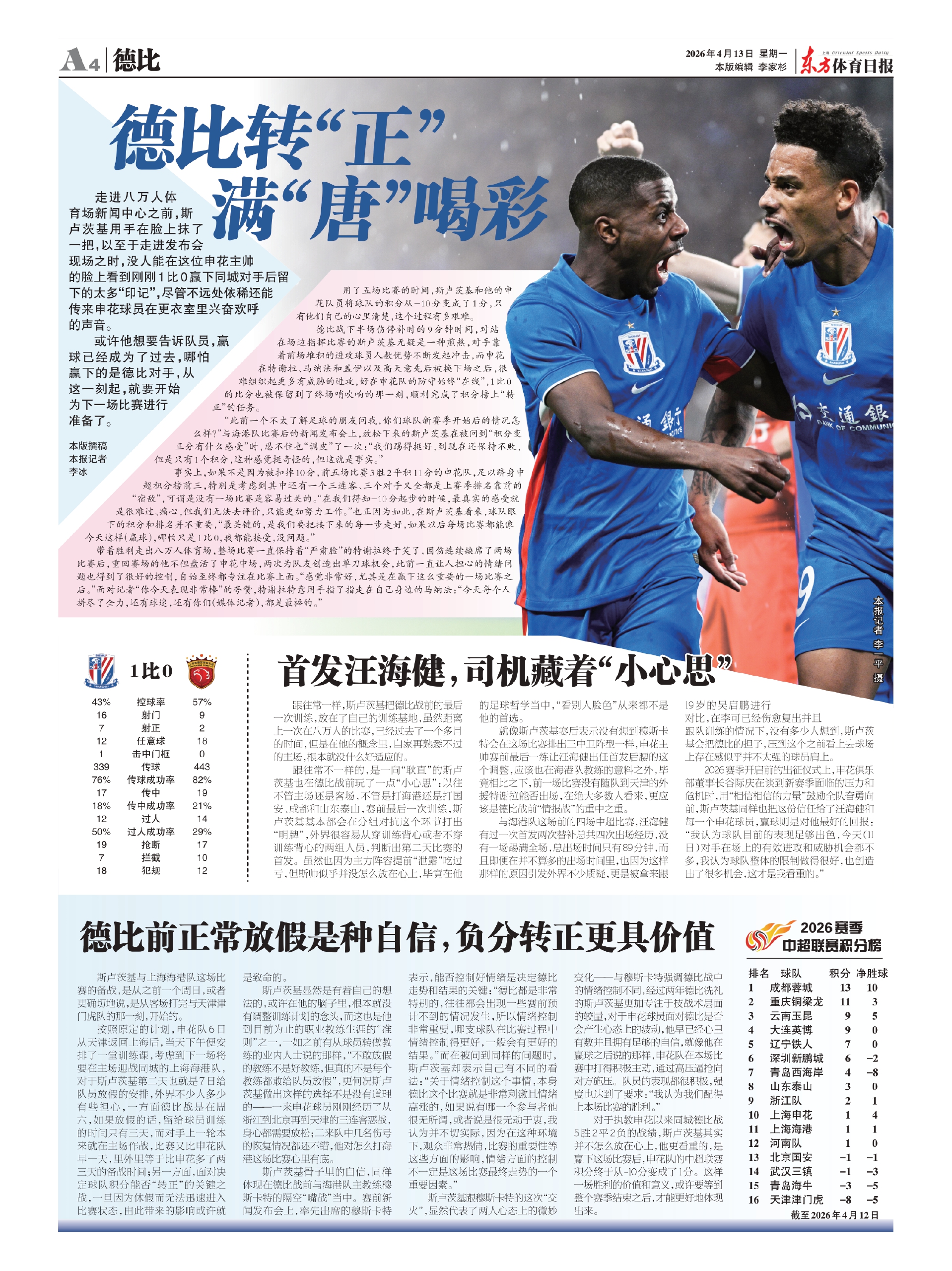 “此前一个不太了解足球的朋友问我,你们球队新赛季开始后的情况怎么样?”与海港队比赛后的新闻发布会上,放松下来的斯卢茨基在被问到“积分变正分有什么感受”时,忍不住也“调皮”了一次:“我们踢得挺好,到现在还保持不败,但是只有1个积分,这种感觉挺奇怪的,但这就是事实。”