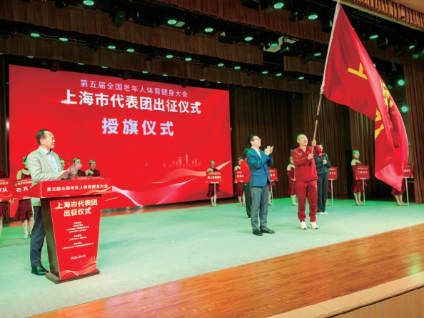 出征仪式上,市体育总会常务副主席赵光圣主持仪式。随着市老龄办副主任娄国剑挥旗授旗,本届老健会上海市代表团总教练孙海平接过团旗,周鹿敏、吴丽萍担任护旗手。三位不同时代的体育传奇人物携手接旗,象征着体育精神的薪火相传,将现场气氛推向高潮。
