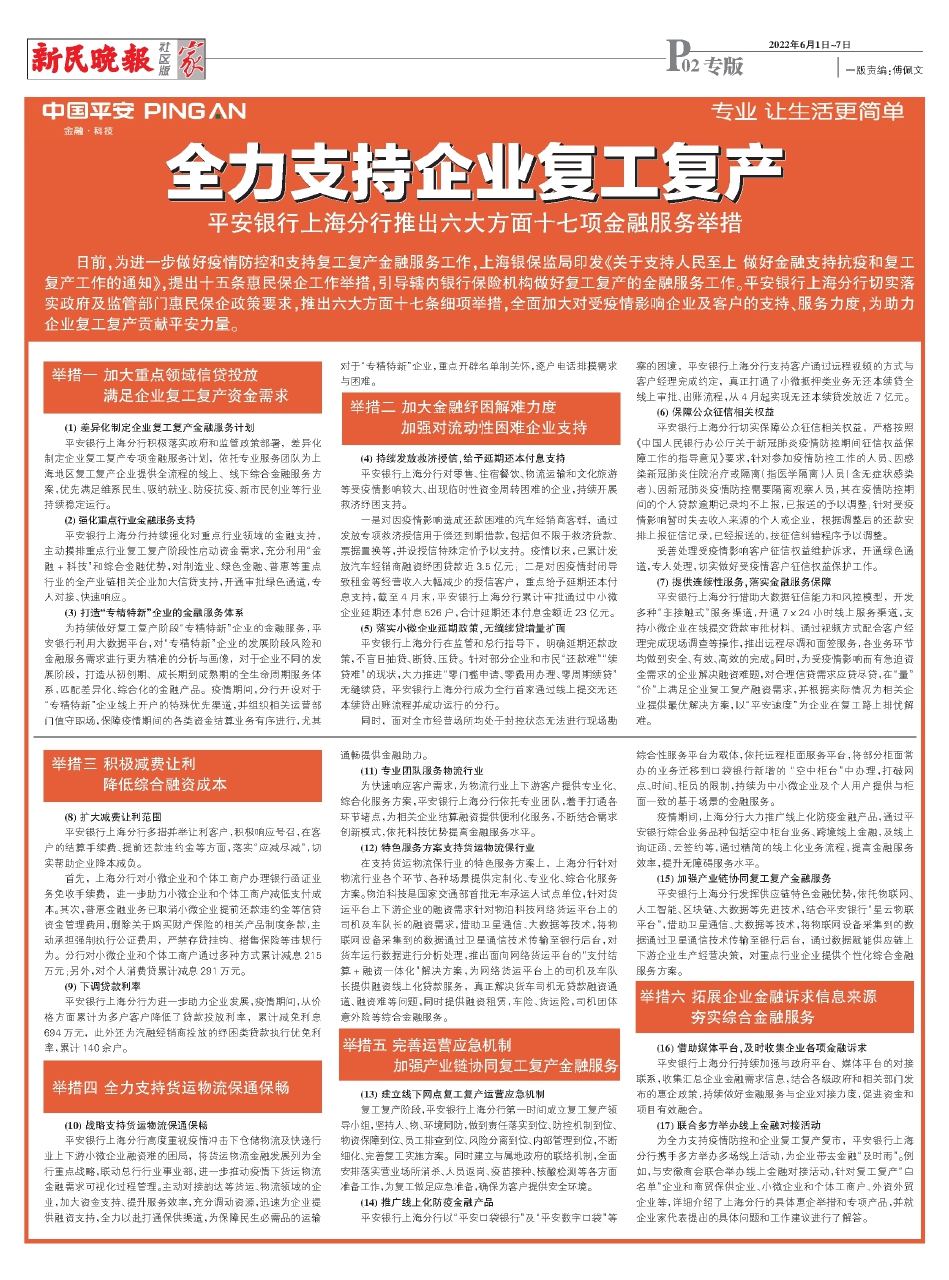 日前,为进一步做好疫情防控和支持复工复产金融服务工作,上海银保监局印发《关于支持人民至上 做好金融支持抗疫和复工复产工作的通知》,提出十五条惠民保企工作举措,引导辖内银行保险机构做好复工复产的金融服务工作。平安银行上海分行切实落实政府及监管部门惠民保企政策要求,推出六大方面十七条细项举措,全面加大对受疫情影响企业及客户的支持、服务力度,为助力企业复工复产贡献平安力量。