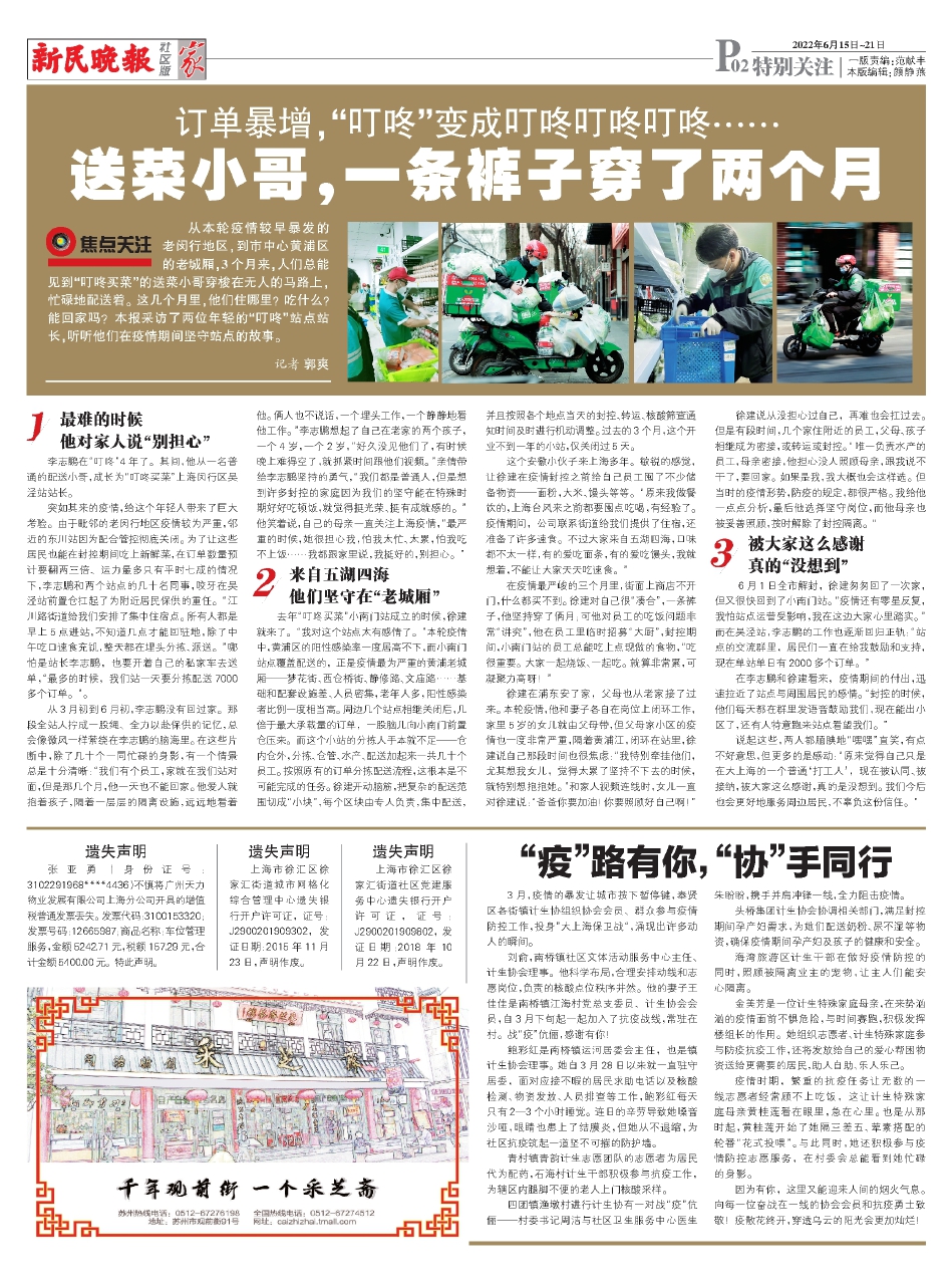 6月1日全市解封,徐建匆匆回了一次家,但又很快回到了小南门站。“疫情还有零星反复,我怕站点运营受影响,我在这边大家心里踏实。”而在吴泾站,李志鹏的工作也逐渐回归正轨:“站点的交流群里,居民们一直在给我鼓励和支持,现在单站单日有2000多个订单。”