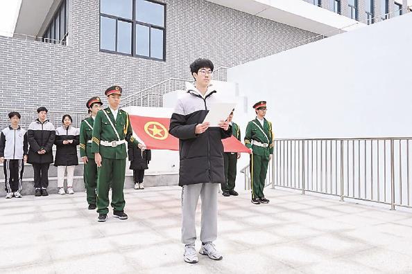 华政附高高一(10)班叶子齐作为新团员代表发言:“作为团员,我们要以身作则,充分发挥团员的先锋模范作用,以实际行动向身边的人传递正能量;要坚定理想信念,努力学习进步,用知识武装自己,不断提高自己的综合素质,用青春的热情和激情,书写属于自己的青春篇章。”