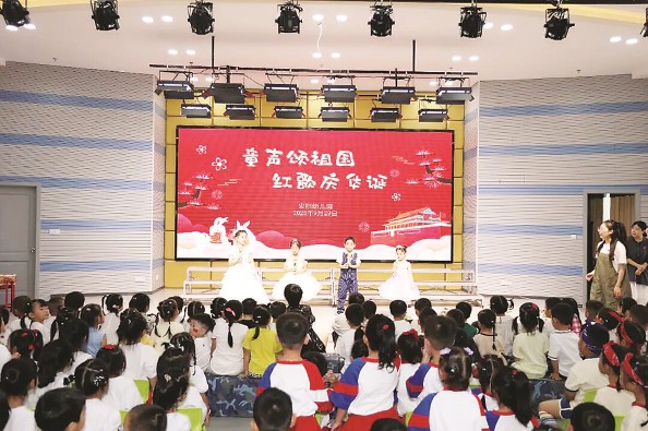 9月29日上午,金山区宏阳幼儿园内飘扬着激昂动人的歌声,悠扬的旋律在园内久久回荡,一场以“童声颂祖国,红歌庆华诞”为主题的国庆节庆祝活动正在这里温情上演。